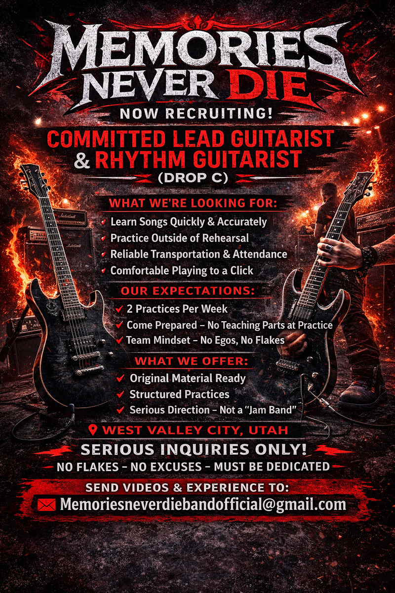 Reliable transportation and equipment, someone reliable and committed and can contribute to the music that's is written, shows up to practices and shows, is able to individual practice as well as practice at rehearsals. be able to work as a group in a group setting. If you have any ego leave it at the door. We do have material already written for our first album, so at first, there will be a lot of learning the material and using your own creativity to contribute make the songs better. After the album has been recorded professionally, the band will come together as a group to create new material.