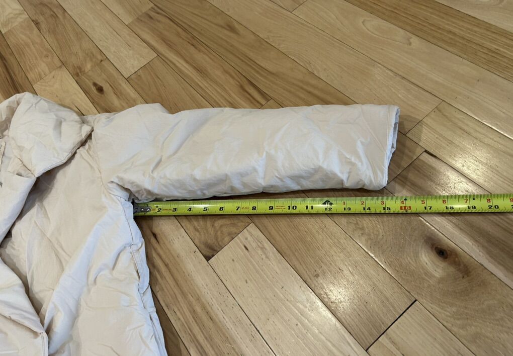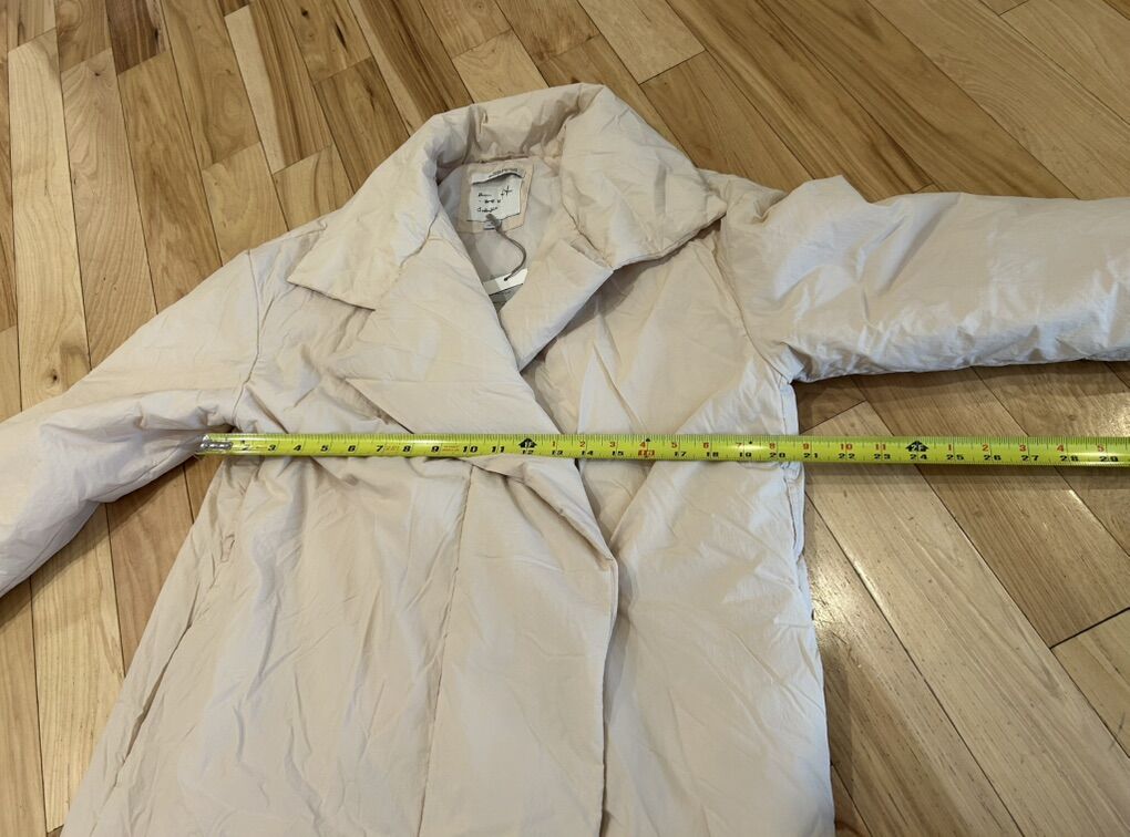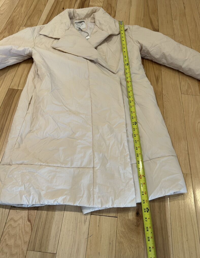 A New Day NWOT Long Puffer Wrap Coat in Light Pink Peach - Women’s Size XS - does not come with a waist tie - single snap front closure - long sleeve with pockets and collar - new without tags (with markings on tag and without waist tie).