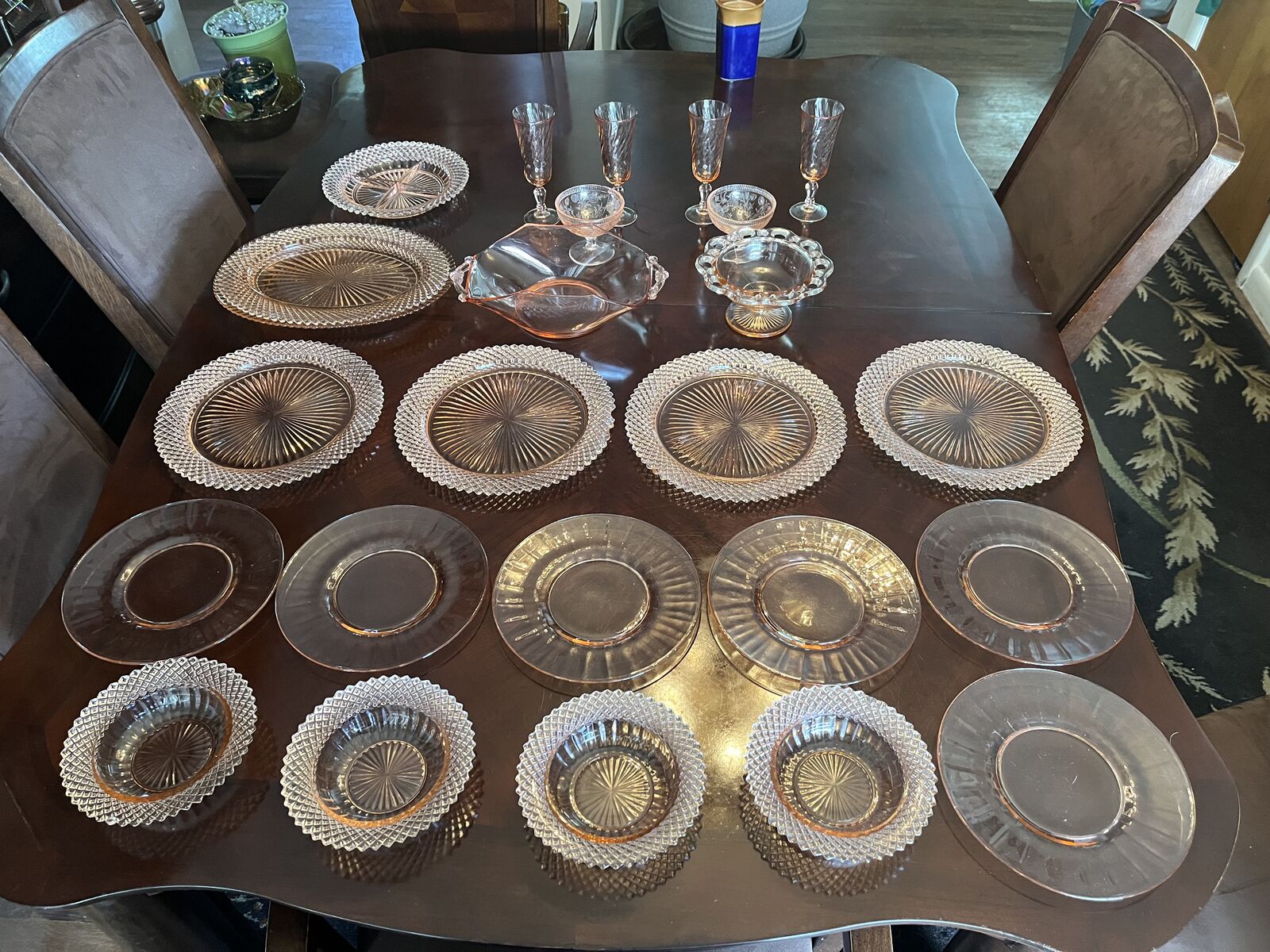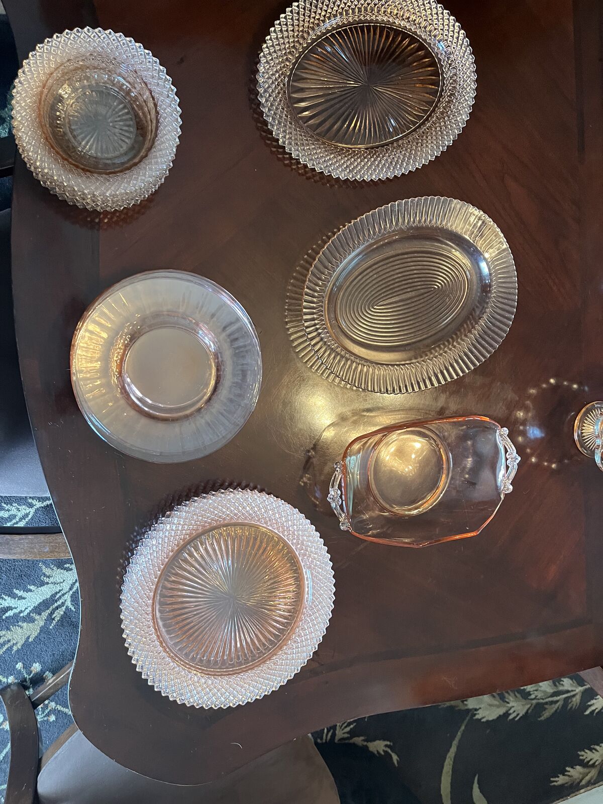 Beautiful set of pink depression glass -2 of the pieces have a chip , the rest are in excellent condition condition . $65 call 385-202-9997