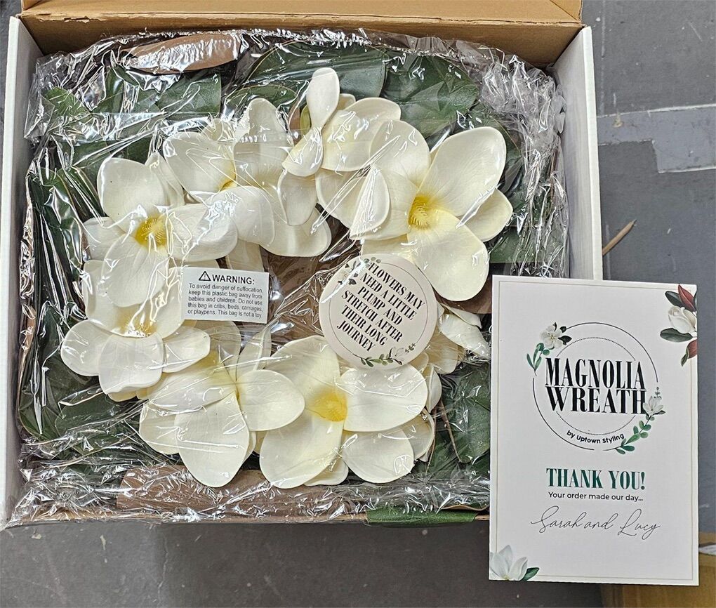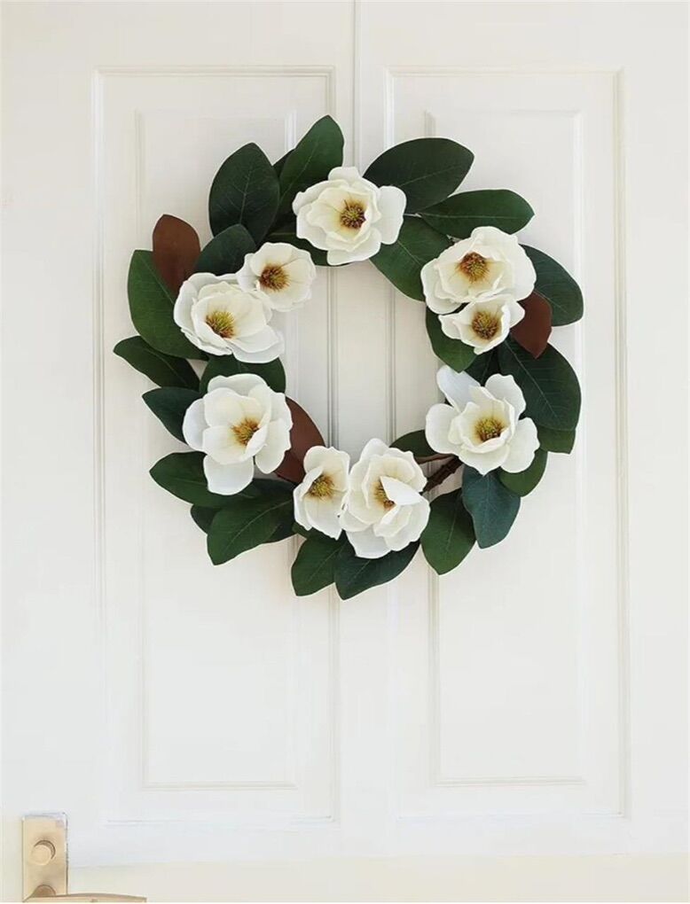 Magnolia Wreath - Gorgeous Life-Like Magnolia Home Decor w Wreath Hanger - 20” Farmhouse Wreath on Faux Greenery Grapevine Frame - Spring Wreaths for Front Door - Welcome Sign for Summer Porch