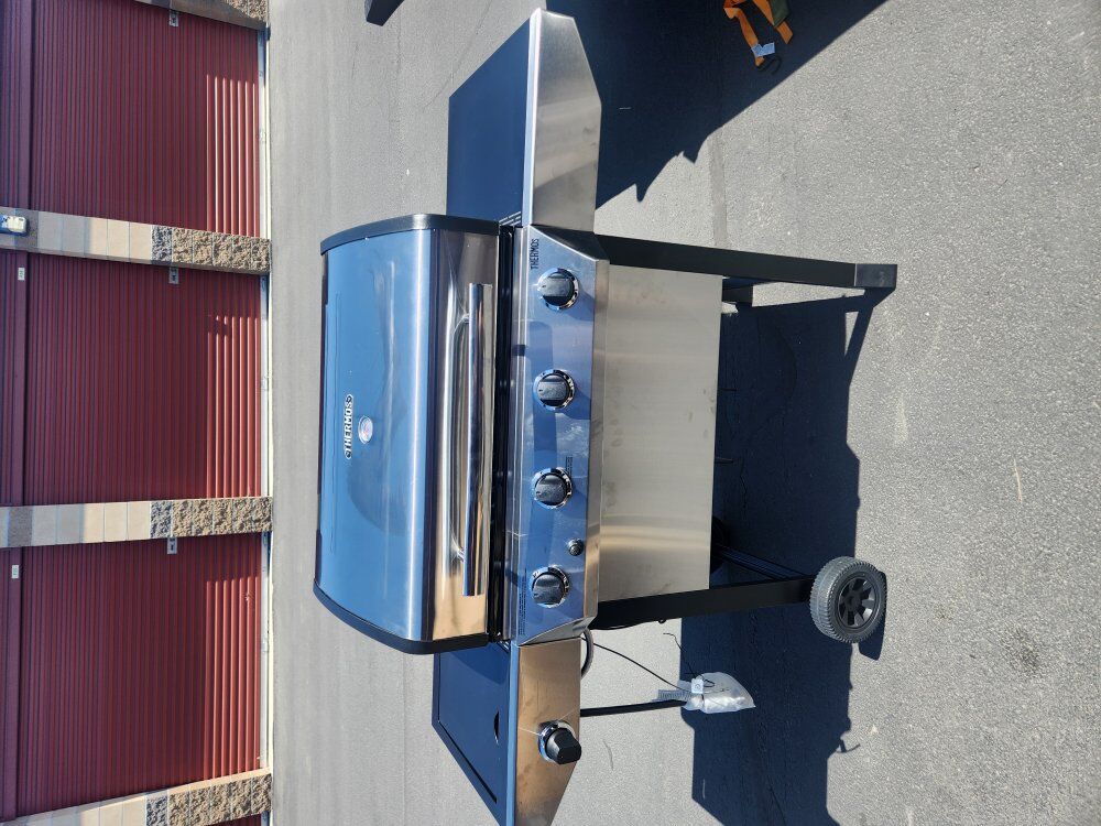 Brand: Thermos Number of burners: 4 Fuel type: Propane Dimensions: 32.60 x 29.10 x 19.90 Inches Material: Stainless Steel Conditio: New Grill type: Gas Grill Btu: 50000 Assembly req: N Features: Warming Rack