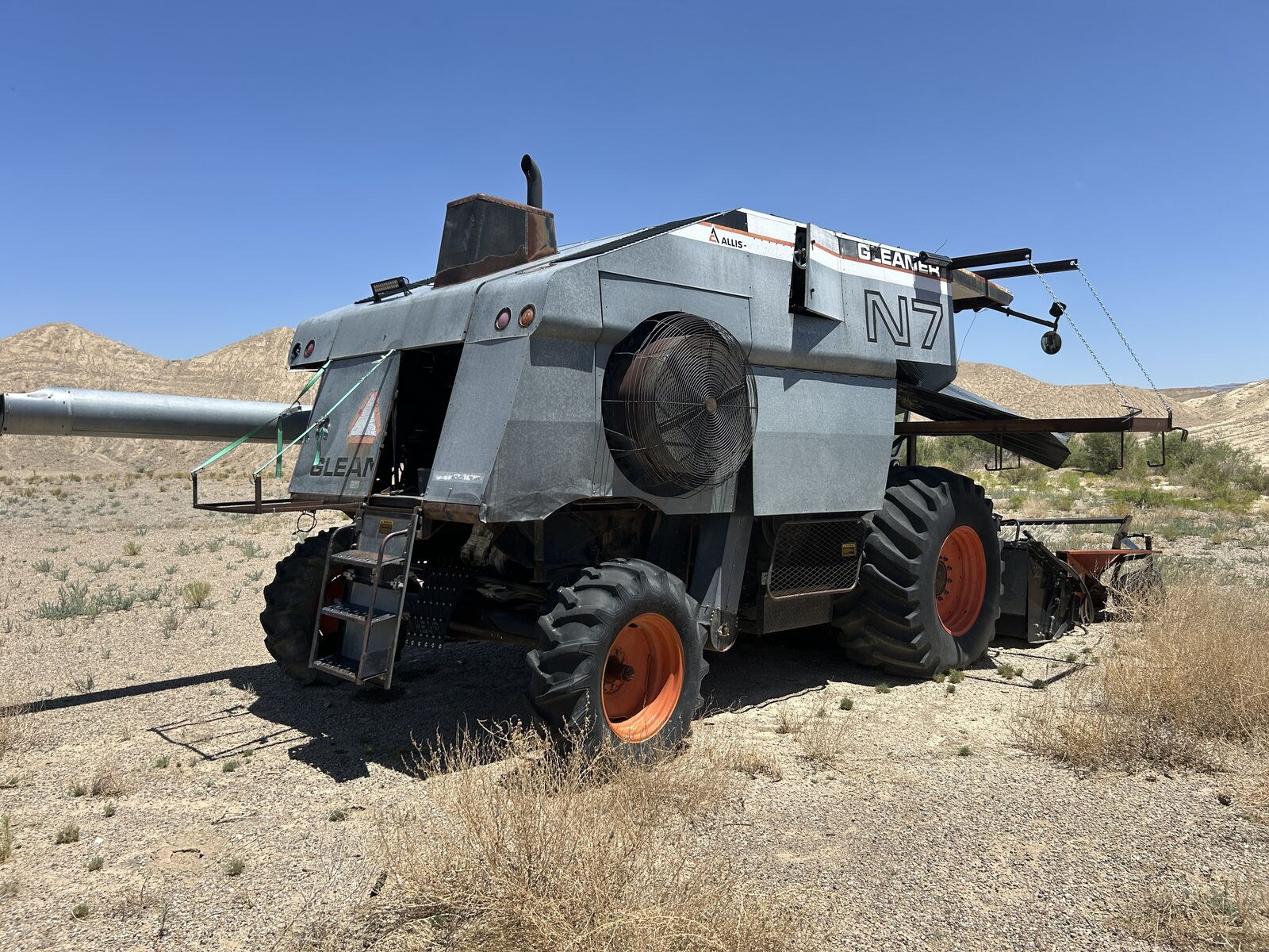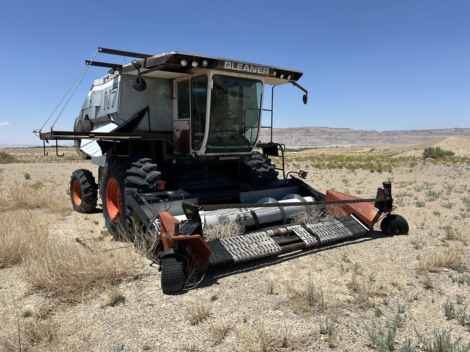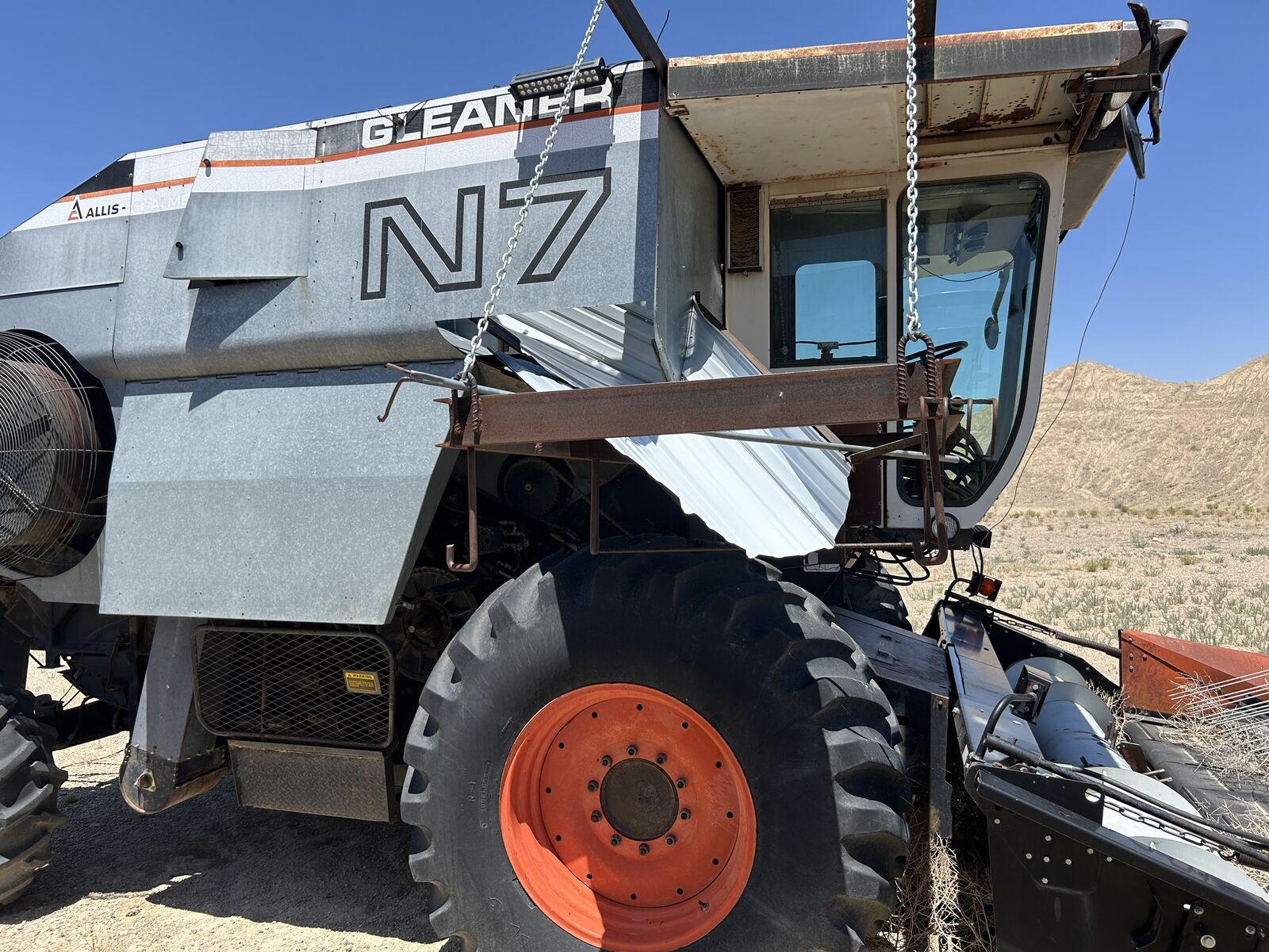 1984 Gleaner N7 Combine with Victory Super 7 Pickup Header, Showing 4189 Engine Hours and 2615 Separator Hours. Has Allis Chalmers 270 HP Turbo Charged Engine, Hydrostatic Transmission, Cab with Buddy Seat, Radio, Heat and AC. Machine is sold as is, where is. Unit has not been started in sometime. Asking $6,000.00 - Located in Green River, Utah