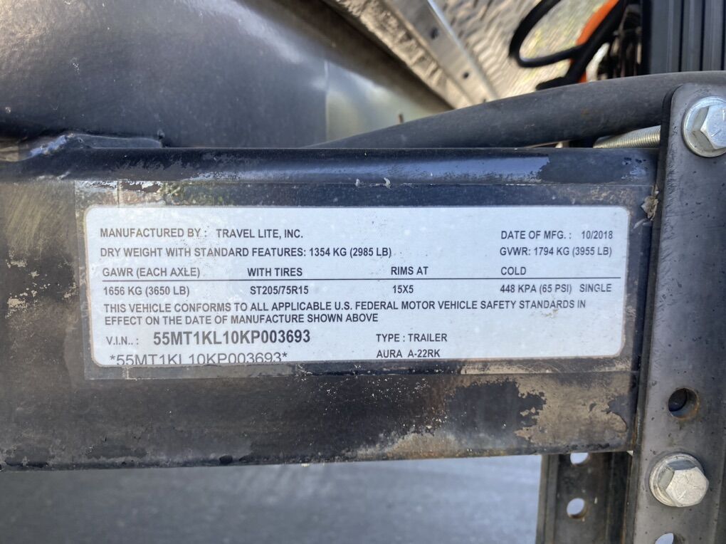 Travel Lite ‘Aura’ lightweight RV. Manufactured 10/18. Vin# 55MT1KL10KP003693