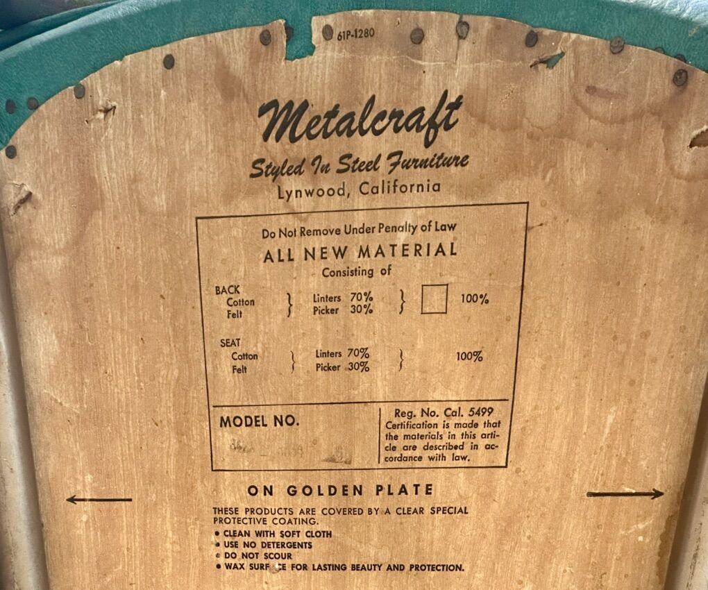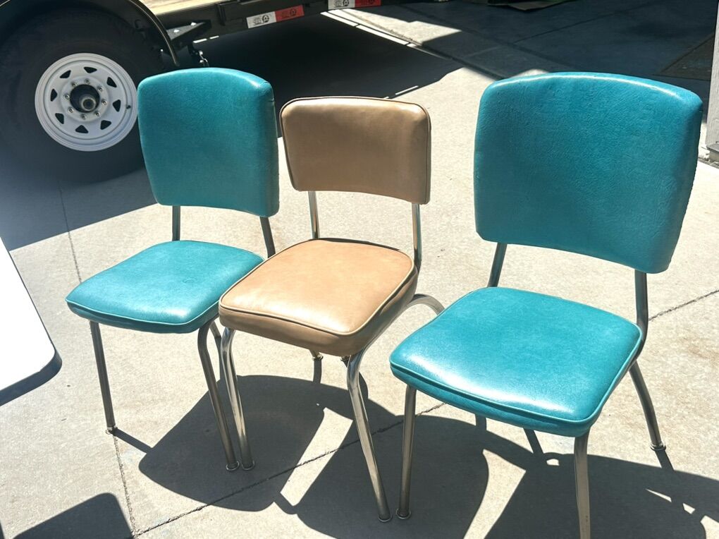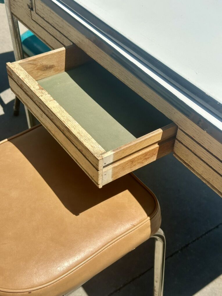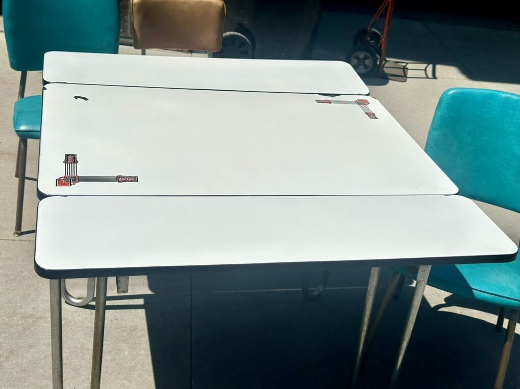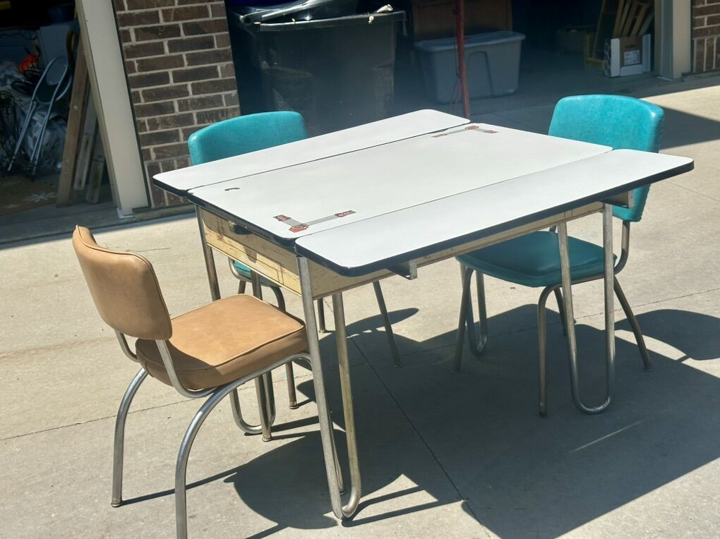 White oak table was made in the 1940’s has beautiful porcelain top. With design and pullout leaves. It has chrome legs. Comes with 3 mid century chairs. One of the turquoise chairs has some tiny tears. 25x40 with leaves pulled in. With leafs pulled out is 46x40