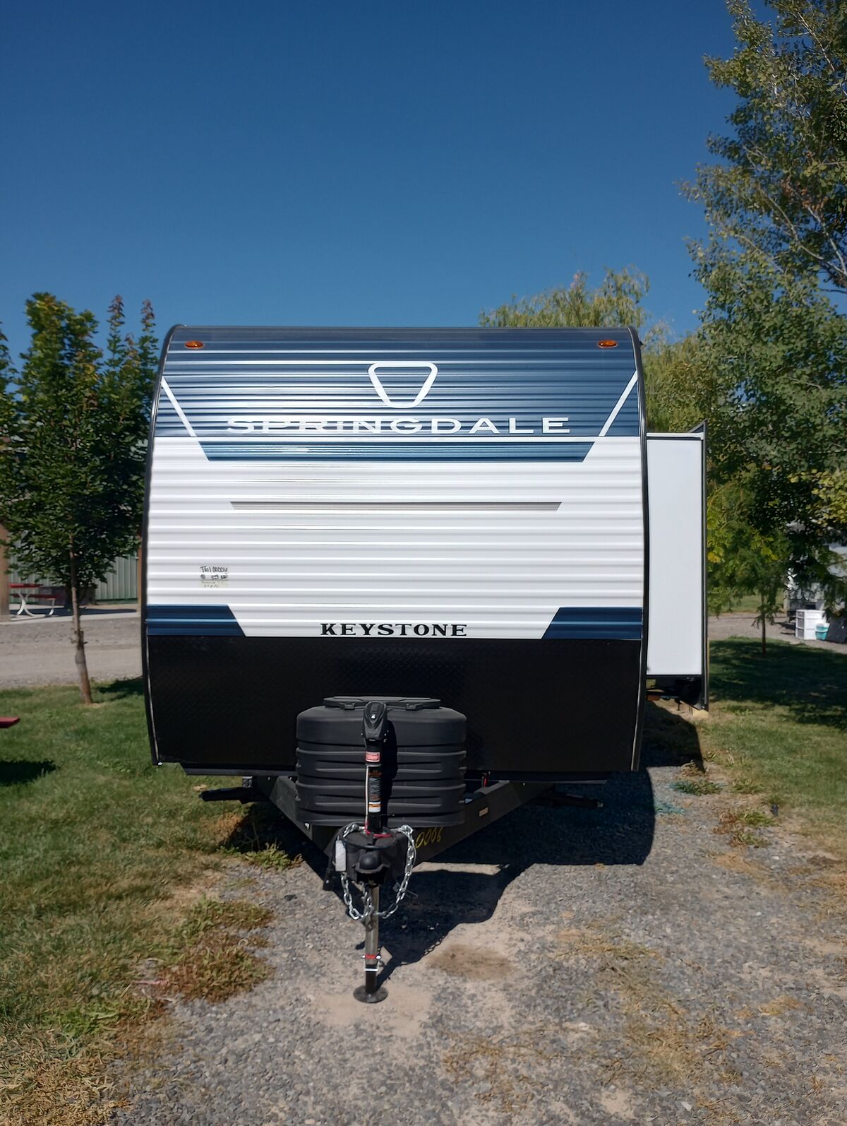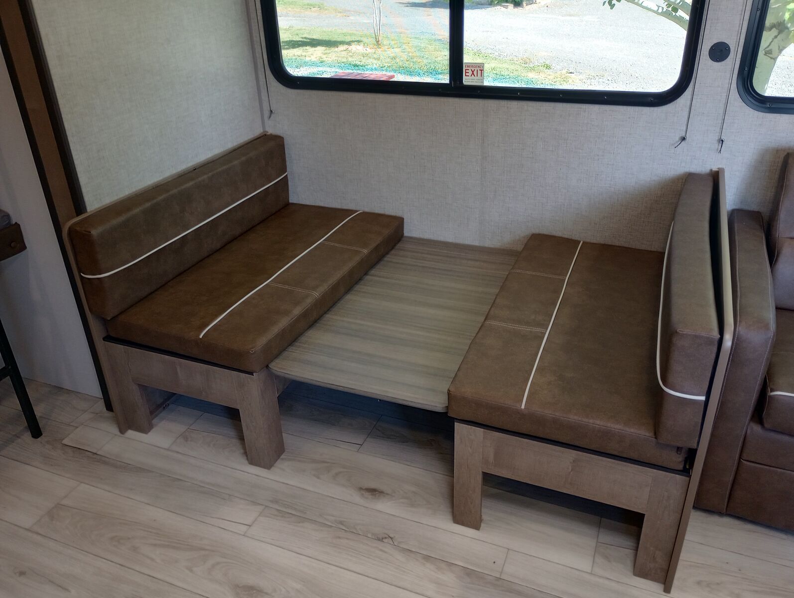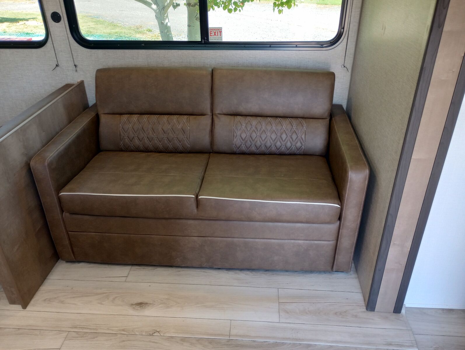 This dual entrance Bunk House model is a great family RV. Access to the bathroom helps keep the “outdoor” traffic to a minimum. The large slideout provides a very open main room for the entire family to sit around and play games or enjoy a movie night. This RV sleeps 8 and has plenty of outside storage.