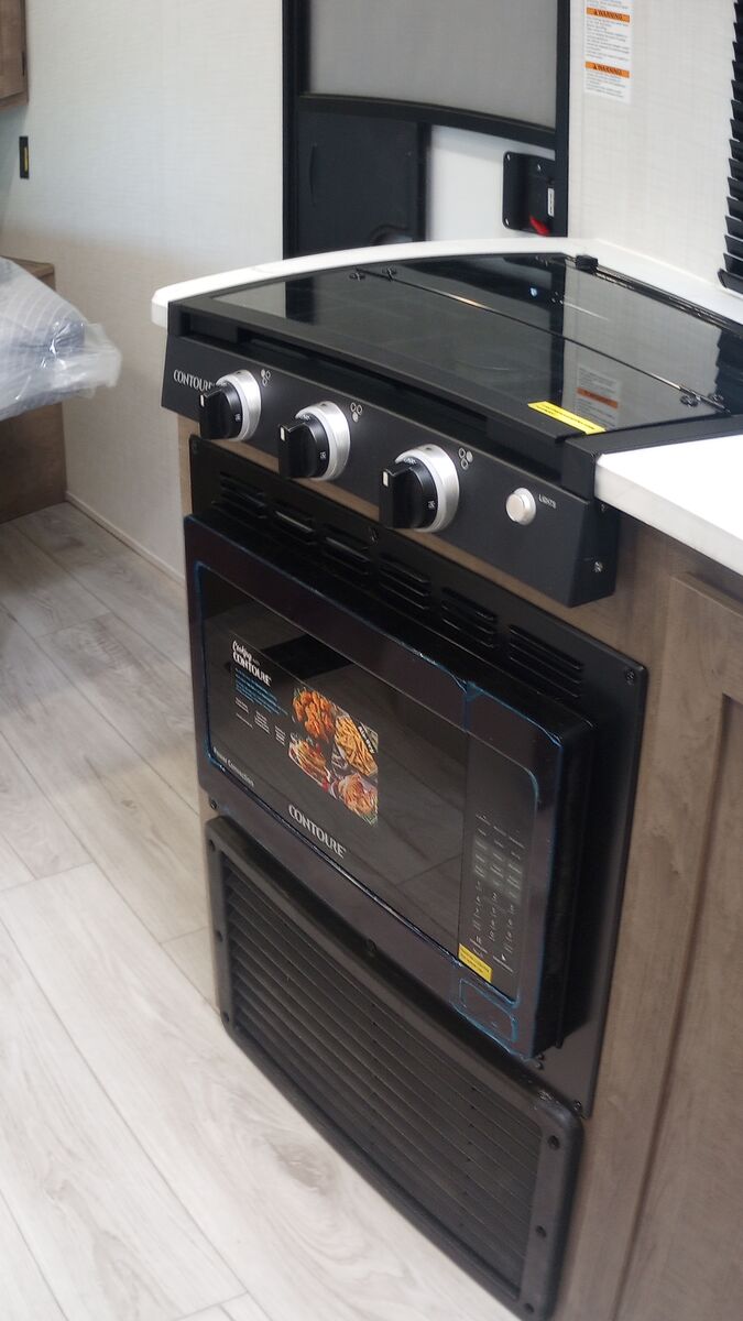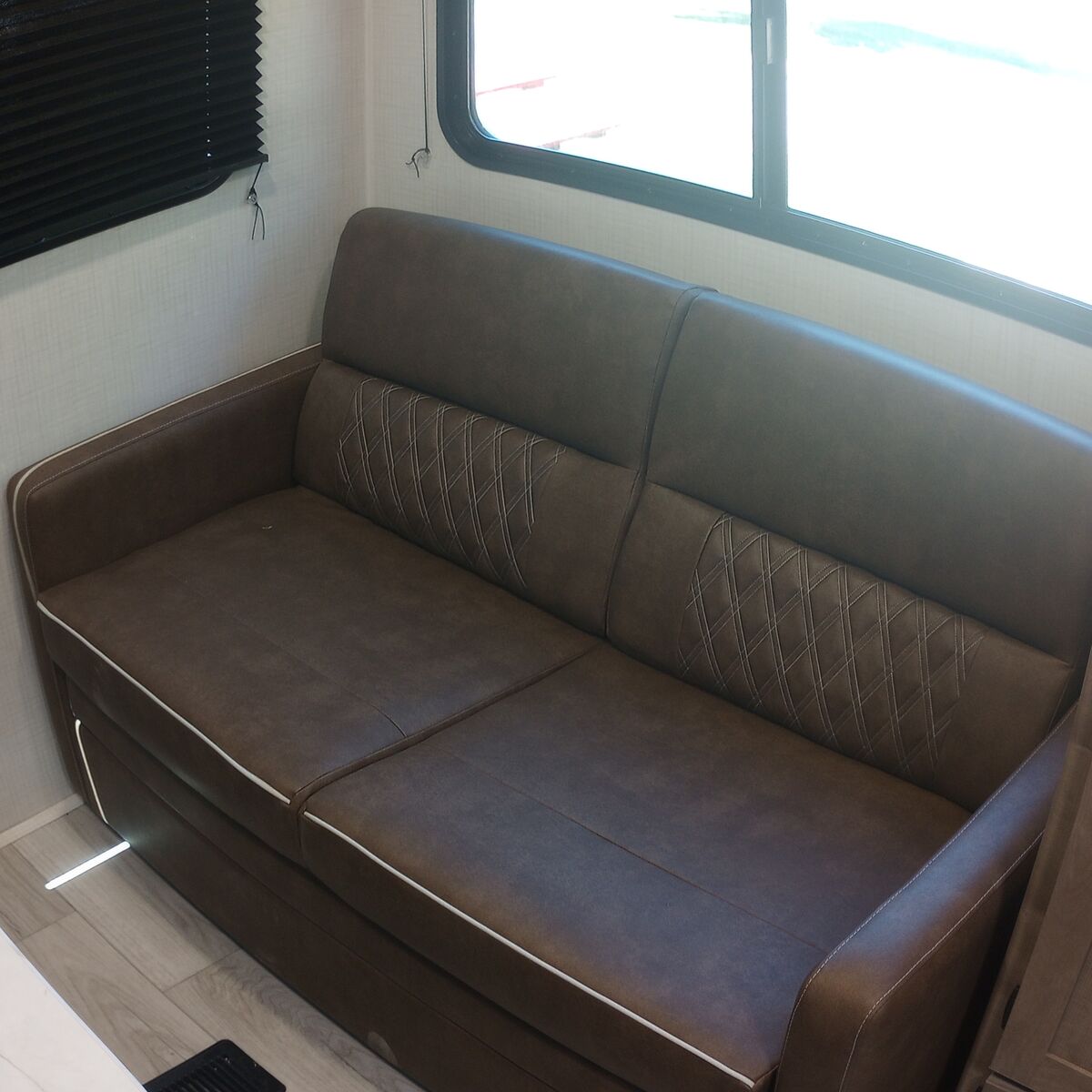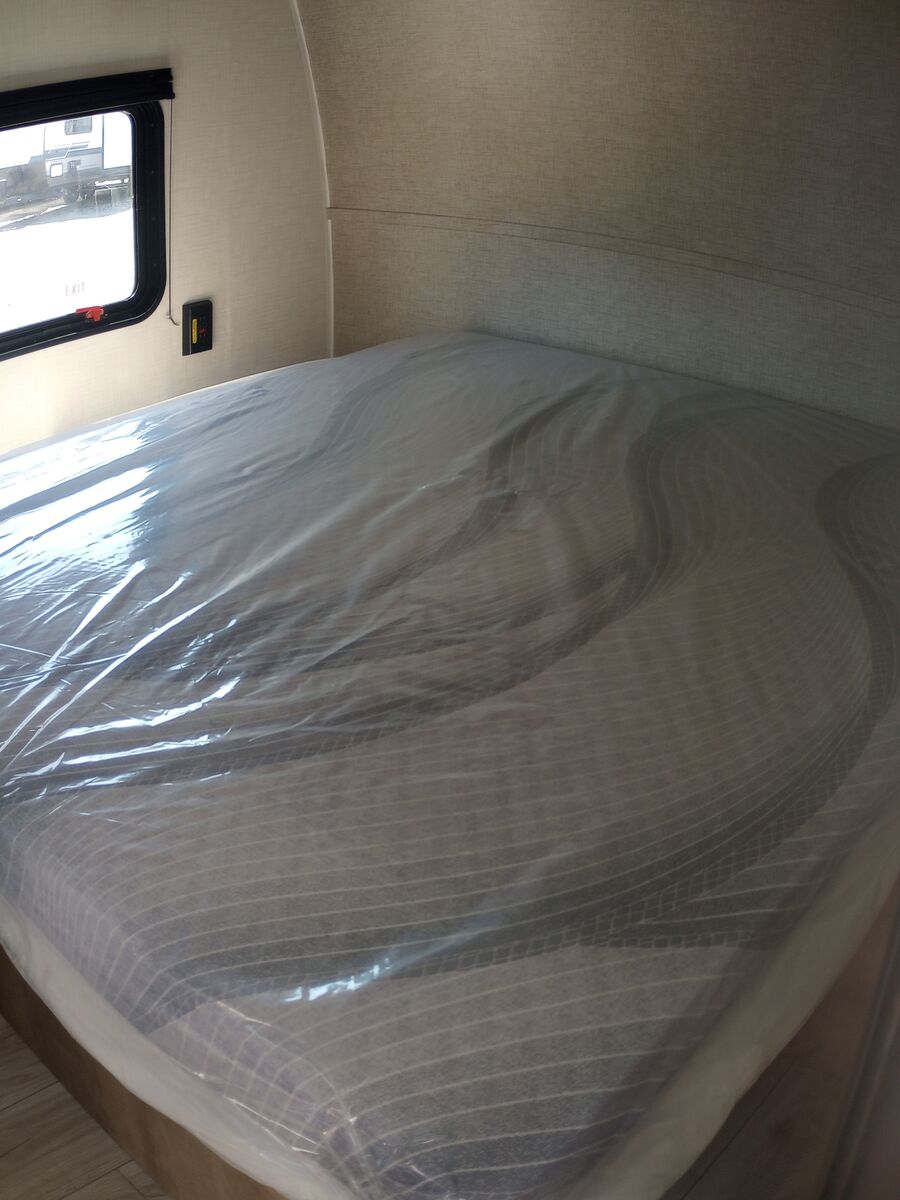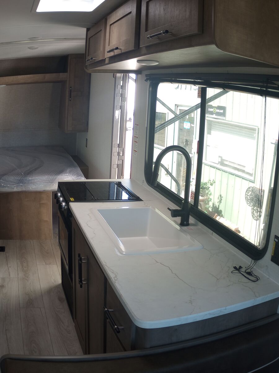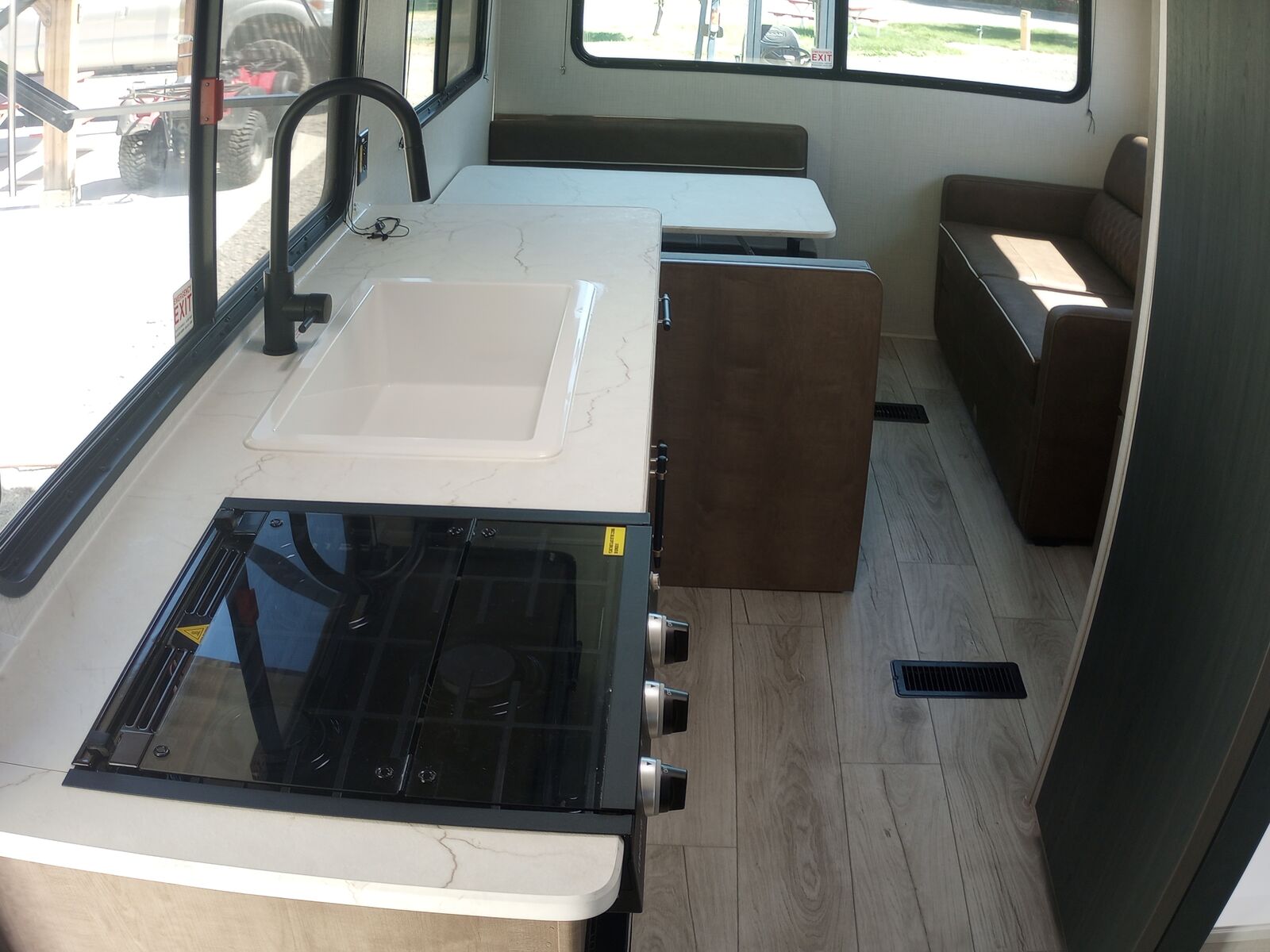 “Easy to Tow” – This is a great light-weight family trailer. The weight is reduced by not having a slide-out but the layout of this tailer makes it really great for the family to hang out together. The rear booth dinette and separate sofa are surrounded by large windows which offers great views of the great outdoors. At the front of the trailer, you’ll find a private master bedroom with a queen-size bed, overhead storage, and bedside wardrobes. This cozy retreat offers a peaceful space to rest and recharge for the next day’s adventures.