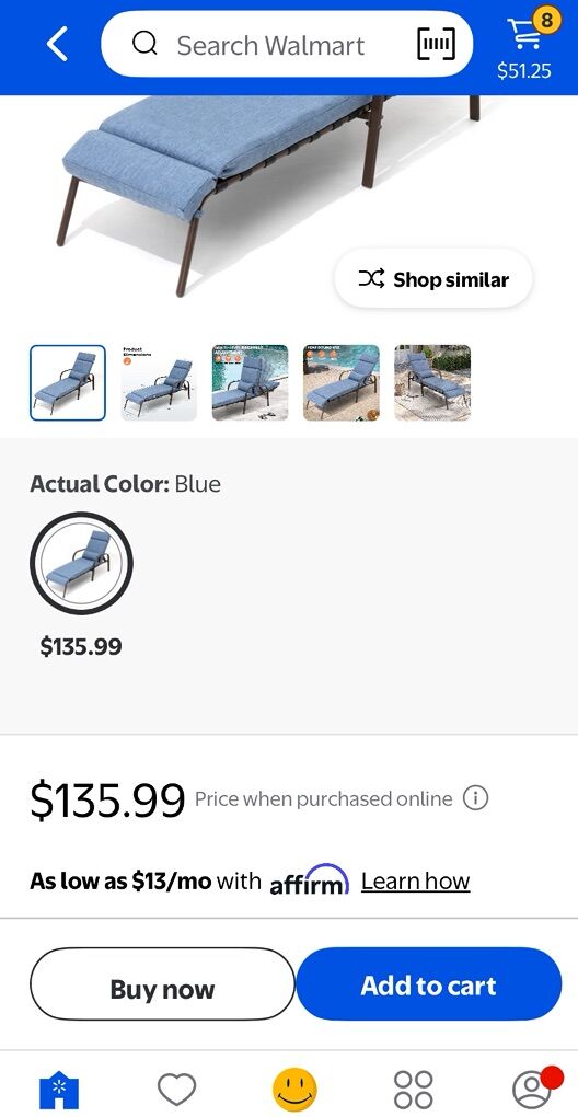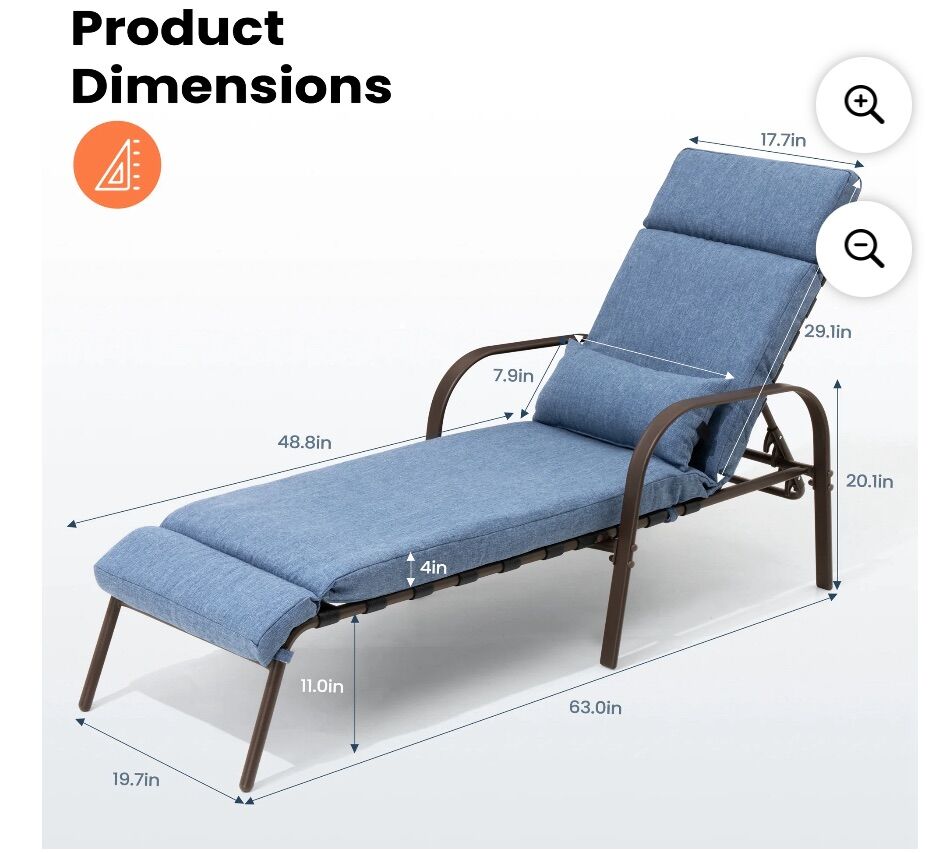 1pc outdoor patio lounge chair Material: Steel Frame & Thick Spongy Cushion and Pillow Maximum load-bearing capacity of 350 pounds Color: dark blue Easy assembly is required.