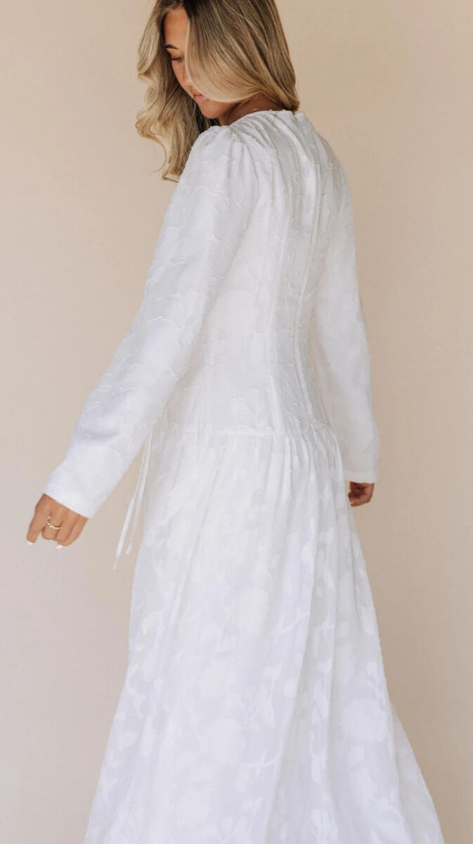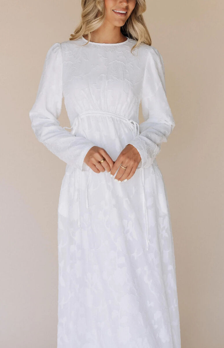 ApplePayThis creamy white temple dress features a back zipper, subtle floral details on dress, and playful tie at the waist. Fully lined for comfort and complete with handy pockets.