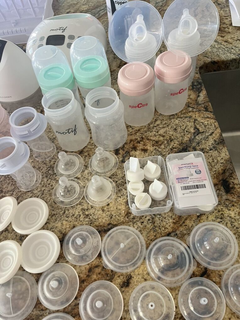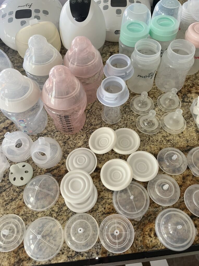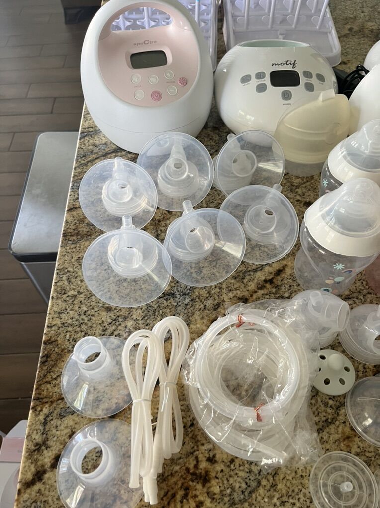 VenmoBreast pump bundle! I have 4 pumps all together (one is not pictured). 1 spectra, 3 motifs, 1 wearable wireless pump, haakaa milk collector, tommee tipper travel bottle and food warmer, 2 bottle drying racks, box of lanisoh breastmilk storage bags, pump bag, baby bottles, flanges, duck bills, literally everything you need for your pumping journey!