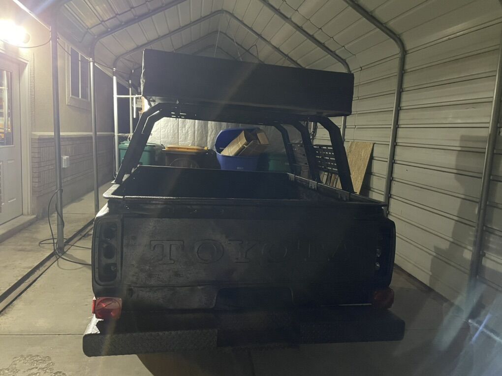 Overland trailer with truck rack and 2 man tent. It has new tires and lights added to the rack.