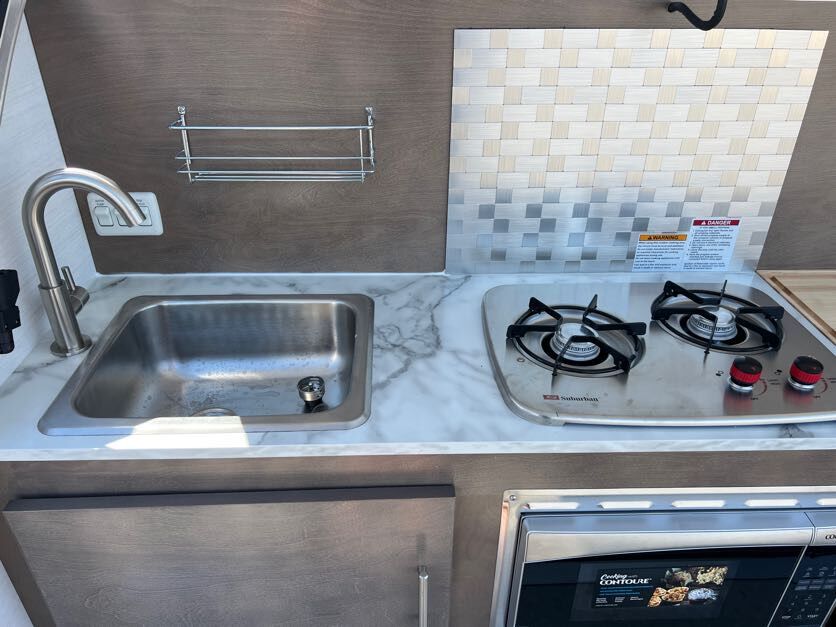 Rear galley kitchen with stainless steel sink, 1-burner stove, and 30L 12V cooler