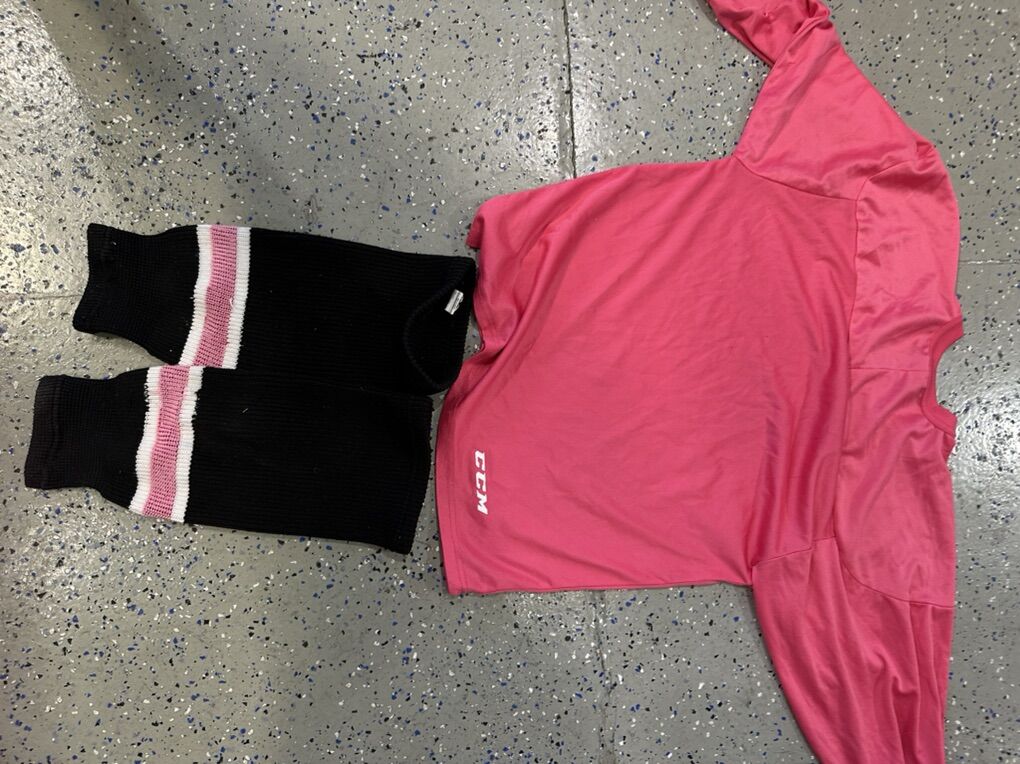 VenmoFor sale is a pink CCM small/medium youth hockey jersey with size 16 inch black and pink socks. This would be good for kids age 5 to 8 years old. There is no number on the jersey and no holes in the socks, it's in good shape.