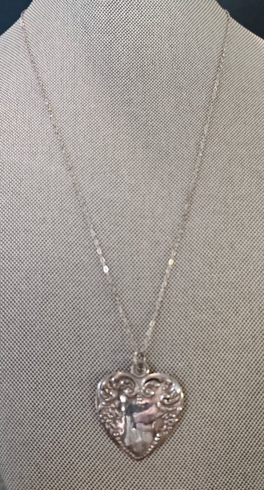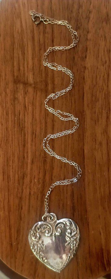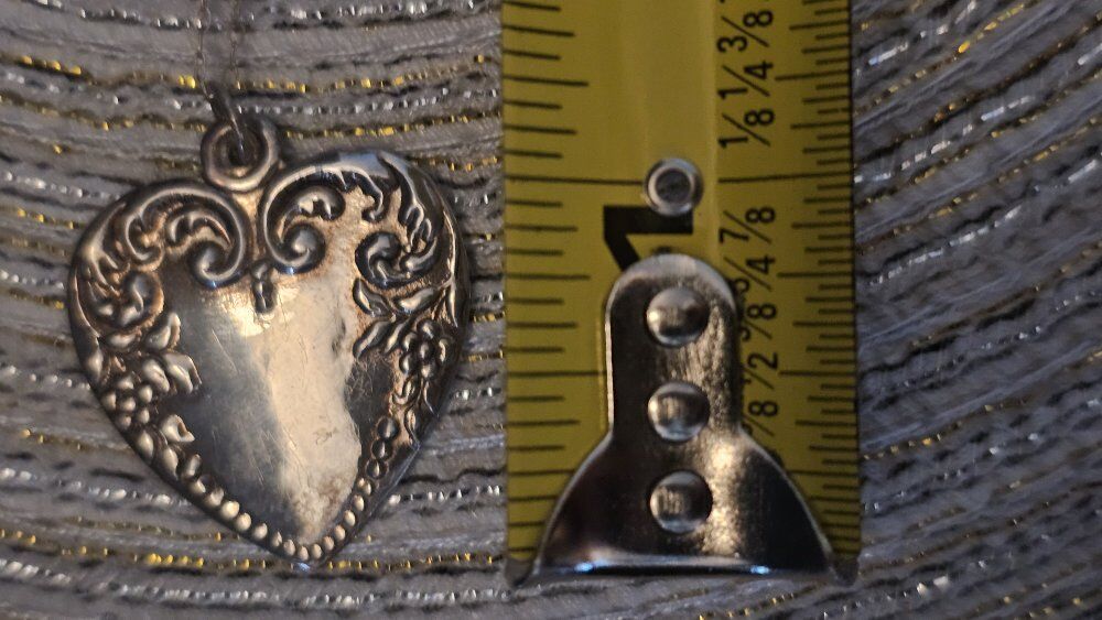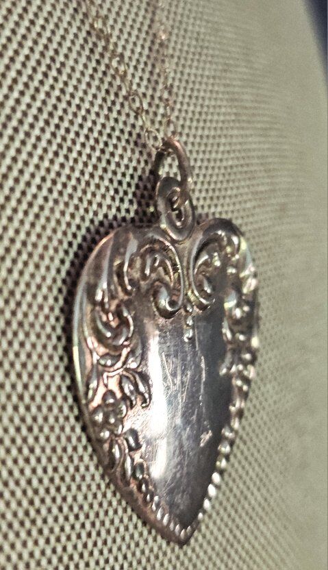 Larger vintage 1.5" X 1.25" STERLING SILVER heart shaped VICTORIAN REVIVAL style necklace. Nicely done period piece, incorporating a repousse floral with scroll & bead work with a bit of patina.