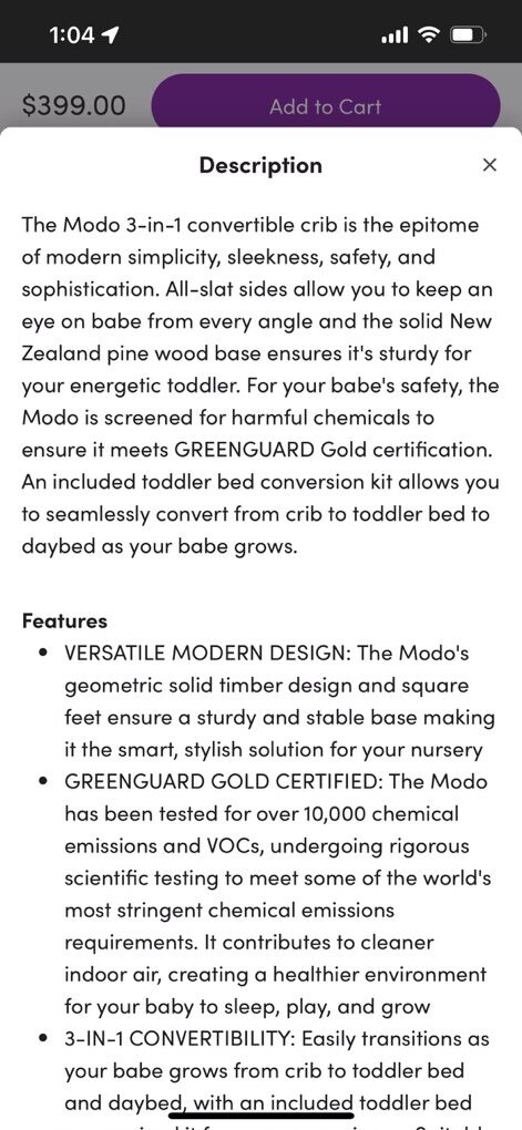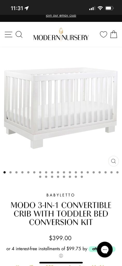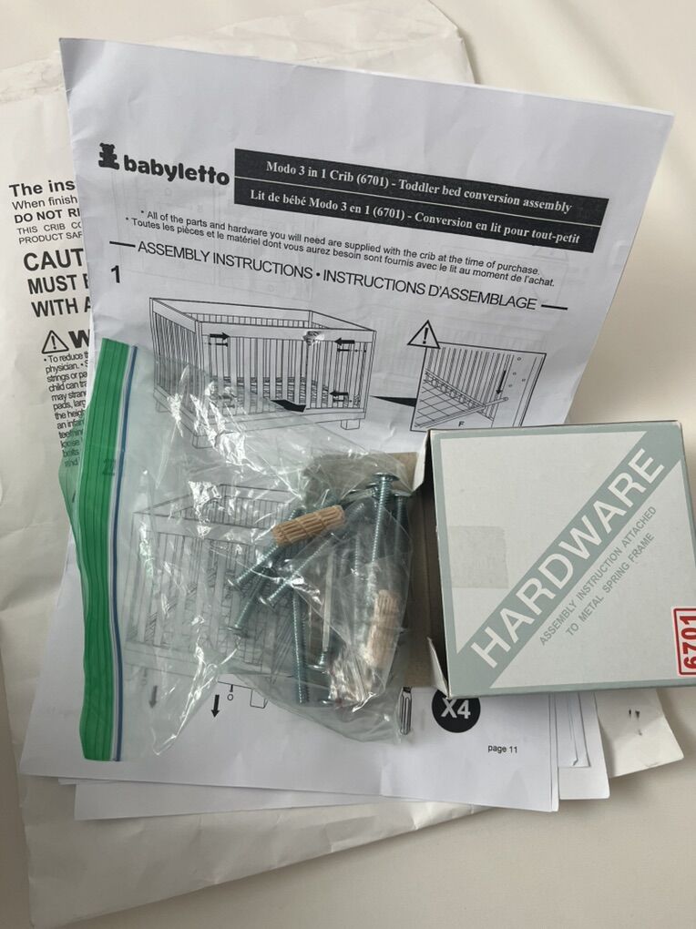 VenmoBabyletto Modo 3-in-1 Convertible Crib, mattress, mattress protectors and zippered sheets.