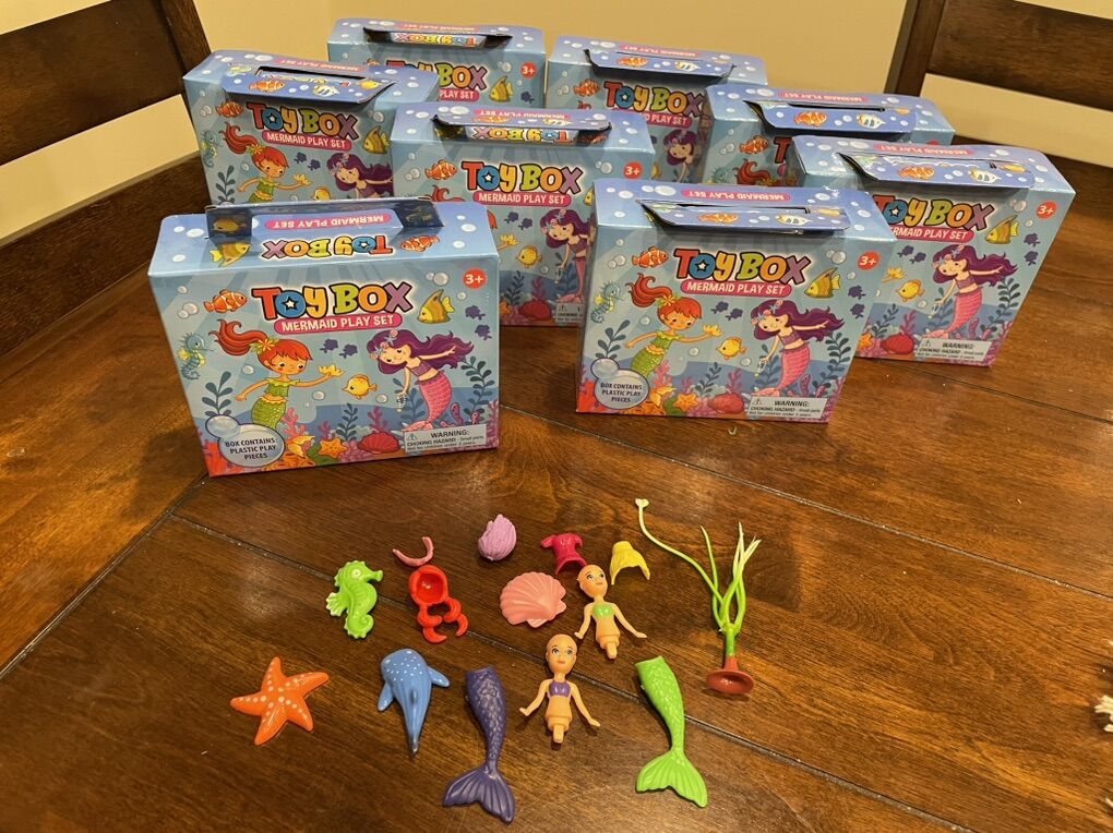 I have 9 new boxes of Toy Box Mermaid Play Sets. I opened one box to take the pictures. One is in a bag instead of a box. It has 2 bodies, 2 tails, 2 hairstyles, 2 shirts, a crown, a shell, a starfish, a seahorse, a fish and a seaweed plant. You can mix and match the parts. They are a rubbery plastic. The price tags show each box was originally $8.95. I’m asking $2 for each or you can take all 9 sets for $15. See my other ads for jewelry, artwork, home decor and more.