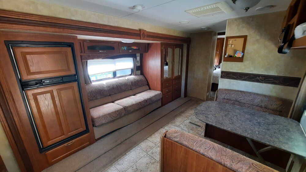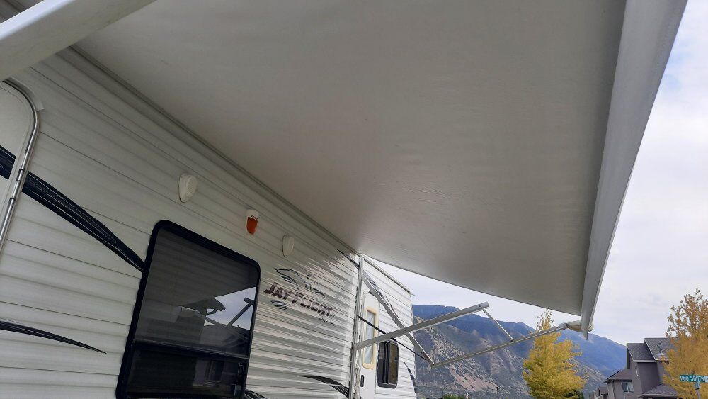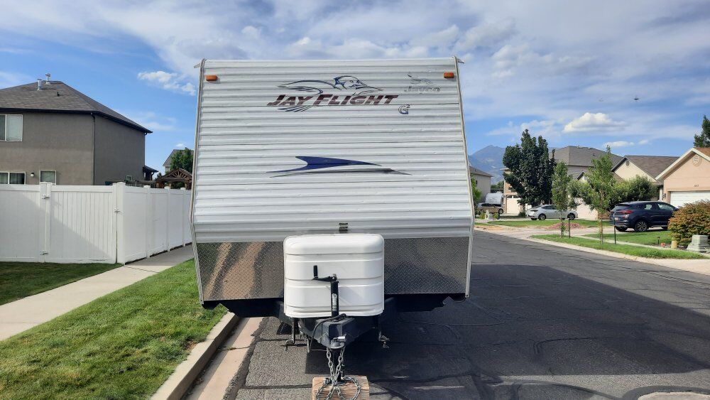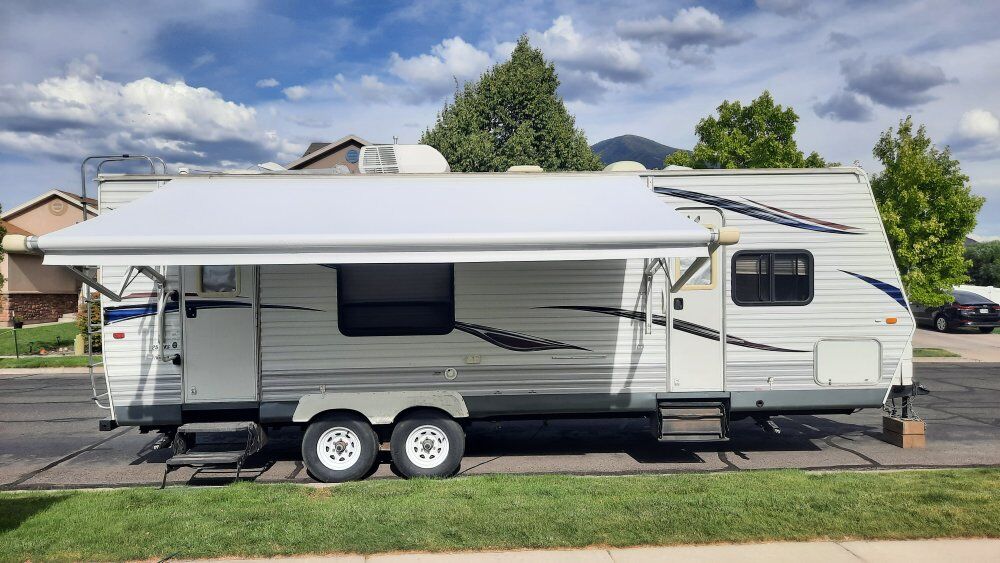 JayFlightG2 25rks 28ft overall length 6500lbs dry weight 8200lbs gvwr Lots of interior storage and room with the super slide. Everything works, no water damage, no smoke or pets. Two 7gal propaine, two batteries, power awning, outside speakers, couch and table make into beds. Well built trailer in great shape. Title in hand, does have a branded title from hail damage with the previous owner, slightly cosmetic on the drivers side. New tires 2023 New awning 2025 Bearings packed 2024 $10,000 obo