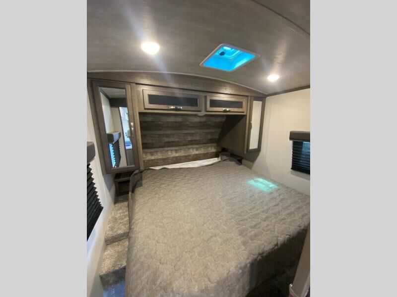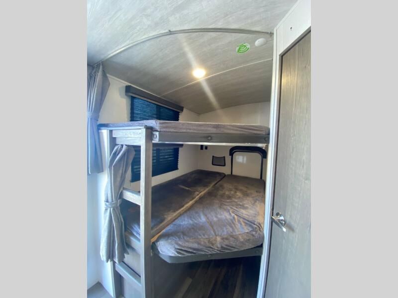 Look no further because this Cougar Half-Ton travel trailer has what you want! With a rear cargo door and pass-through storage, you can bring along loads of gear, and you can also bring along lots of food because the indoor and outdoor kitchen will provide you with plenty of tools to cook it up. At the end of a long and tiresome day, you will want a place to relax, and that is when the king-size bed shines best. This bed is hidden away in a private bedroom so that you can recover peacefully. Your kids can also take a break back on the double-size bunks, and the lower bunk is able to flip up for storage.