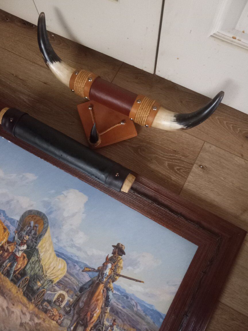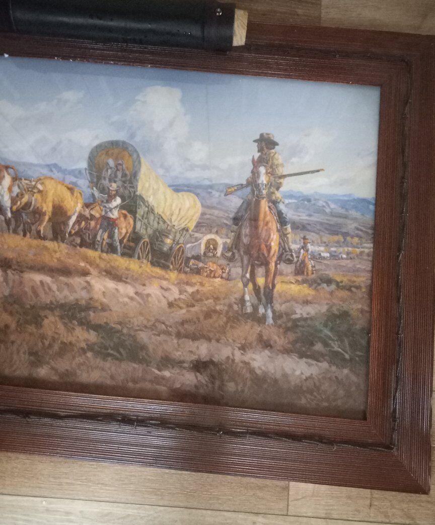 BEAUTIFUL WESTERN PAINTING WITH A MAGNIFICENT WESTERN LOOKING FRAME. THIS MEASURES 39" X 27". A PAIR OF ELK HORNS WAS FASTENED TO IT BUT CAME OFF. IT CAN BE REPAIRED OR REMOVED ALONG WITH THE BLACK ROLL THAT IS ON THE TOP OF THE FRAME AS SEEN IN PHOTO. THIS IS A GORGEOUS PIECE AND WOULD LOOK GREAT IN A DEN OR LIVINGROOM. THE FRAME IS VERY RUGGED LOOKING IN BROWN WOOD DECORATED WITH WIRE AS SEEN IN THE PHOTOS.
