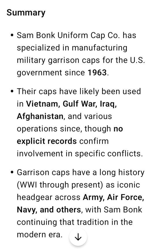 VenmoThis Sam Bonk Uniform Garrison Cap Co. Vintage Mens Military Hat is made of a poly wool and in great condition with no stains or odors. I found a similar one on Ebay for $23.