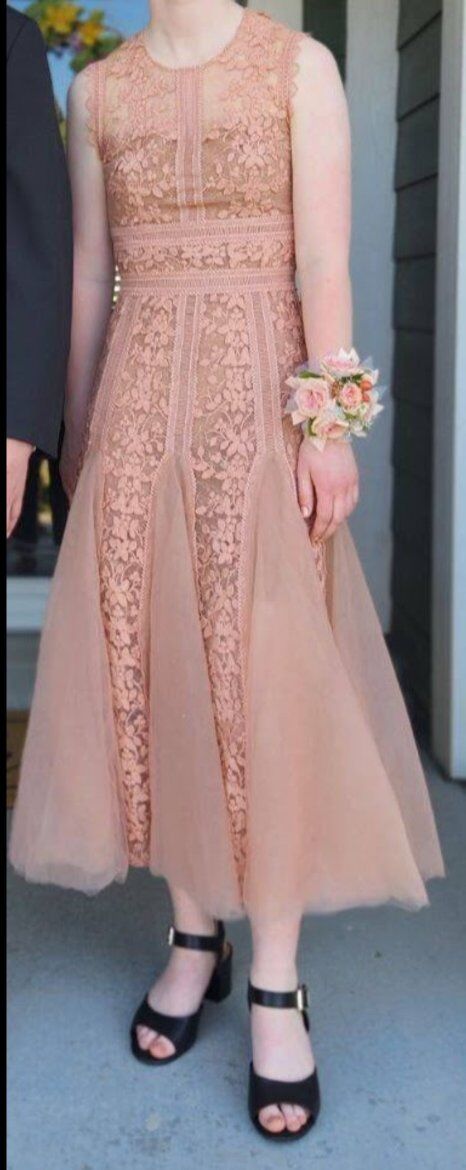 This dress is amazing! It's so unique, comfortable (since it's satin-lined), and absolutely stunning! The details are all real lace, and the bottom gets some really nice volume from the tulle skirt. It's perfect for any formal dance!