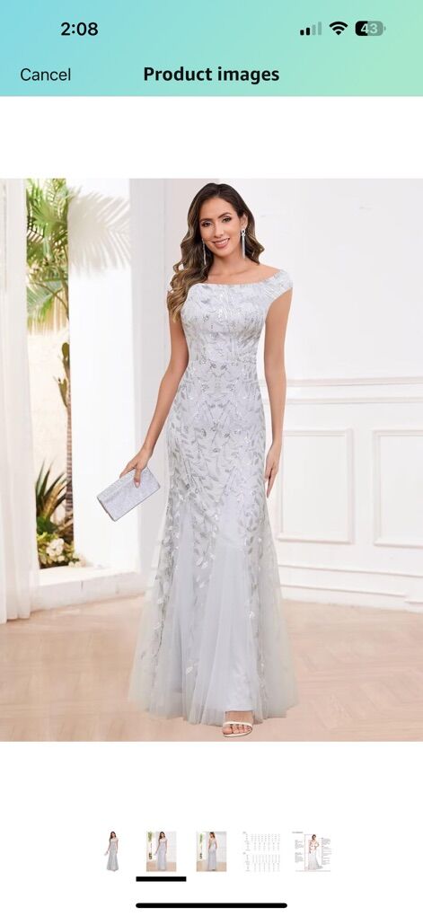 VenmoBrand new never worn, Silver Mother of the bride dress for women , sequin, mermaid cut, off shoulder evening gown. Beautiful. Size 10 I purchased it for $85.00 but am unable to return it. I bought it for my daughter’s wedding and her colors changed. Dresses good for any special occasion. Pick up in Layton. I included the ad pics and sizing chart for you. It is very true to size when using the sizing chart attached. Asking $60 OBO. All sales are final. Check out my other listings as well. Thank you for looking.