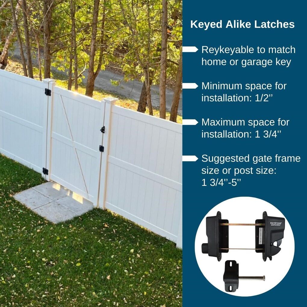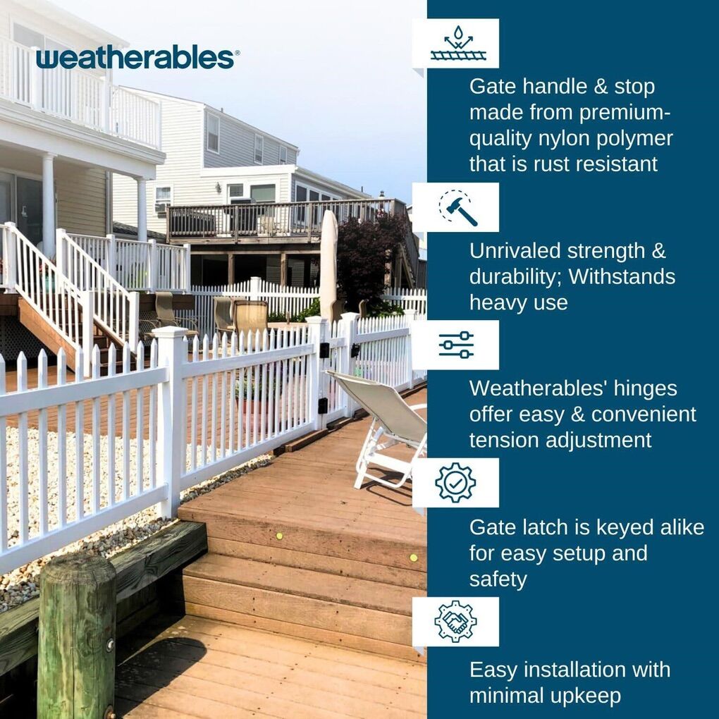Weatherables vinyl fence Gate Hardware kit is the all-in-one solution for single-gate DIY assembly that is reliable, durable, and lasting. LOCKABLE GATE LATCHES FOR SECURITY: Our outdoor gate latch is designed as a dual-sided fence gate latch that locks and unlocks from either side. Latch is reversible for right or left-hand outdoor gate lock openings and rekeyable to match a key of your choosing