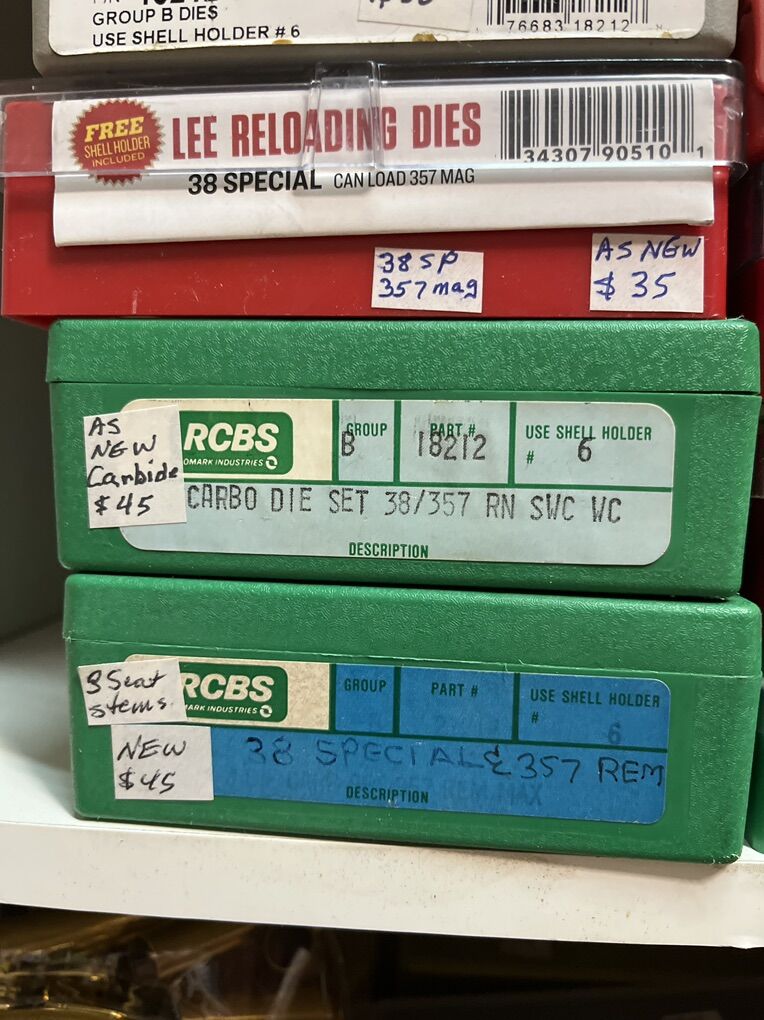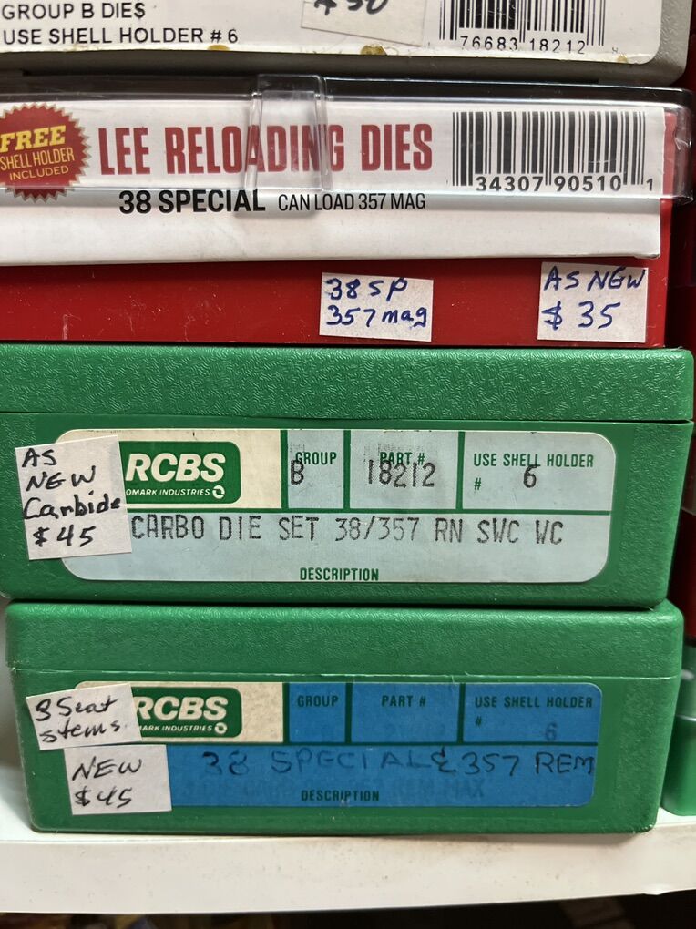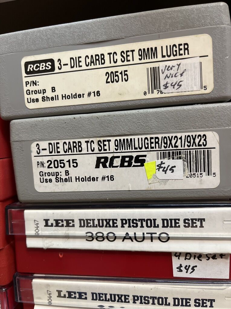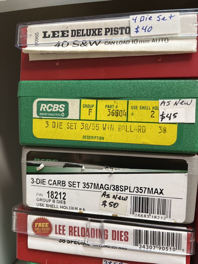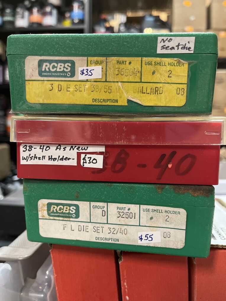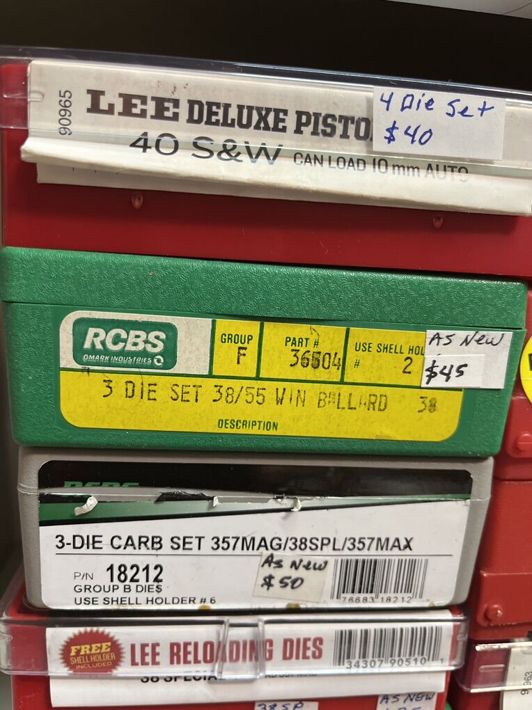 32 Auto RCBS carbide for $45. 32 sw long Hornady $25. 32 sw L M. RCBS carbide sizer. No seat die. $30. 32-20 WCF rn RCBS $45. 380 auto modern steel RCBS $20. 380 auto RCBS carbide sizer. $45. 2-380 auto Lee 4 die set for $45 each. 2-9mm Luger RCBS carbide for $45 each set. 9 mm Luger Lee breech lock dies. New $40. 9mm Luger Lee 3 die set as new for $30. 9mm Luger Lee 4 die set for $45. 9mm Luger Hornady carbide for $45. 9x18 makarov Hornady for $45. 2-38/357 as new carbide RCBS for $45. 38/357 Lee 3 die set for $35. 38/357/357 MAX RCBS as new $50. 38/55 WIN Ballard as new $45. 40 sw/10mm Lee 4 die set $40. And take 10% of these prices. Inventory reduction please! I will ship for postage costs. Please see my other ads and bring cash. Thanks, Joe.