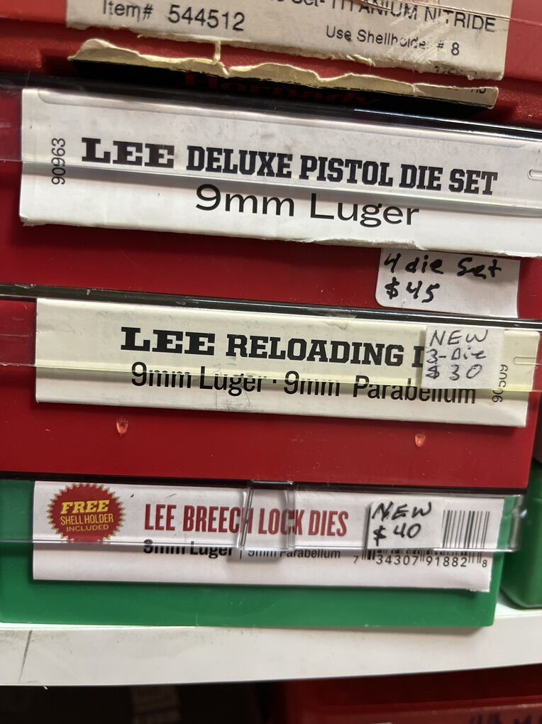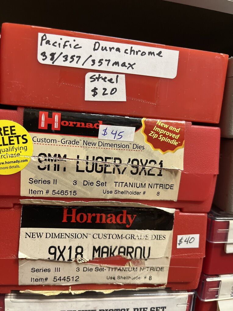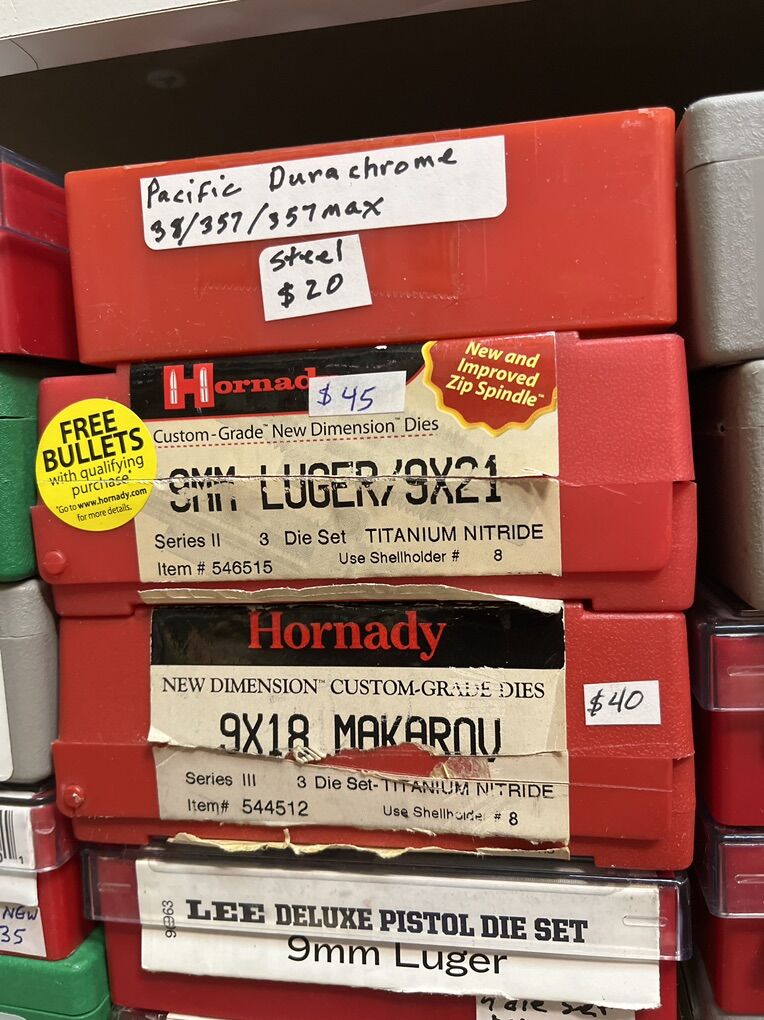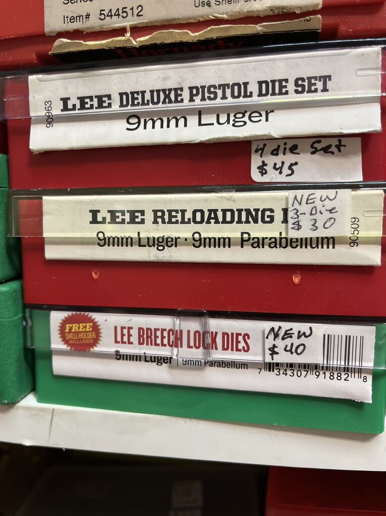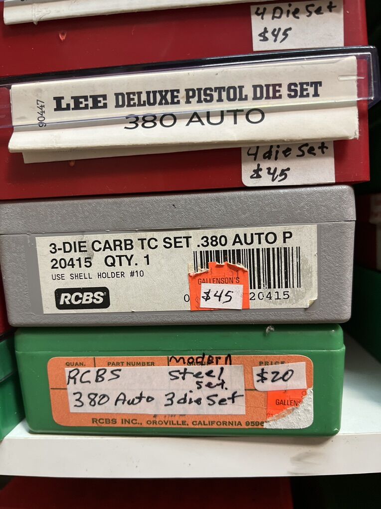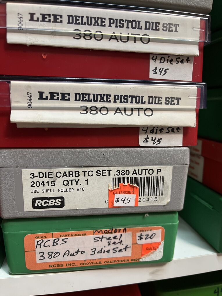 32 Auto RCBS carbide for $45. 32 sw long Hornady $25. 32 sw L M. RCBS carbide sizer. No seat die. $30. 32-20 WCF rn RCBS $45. 380 auto modern steel RCBS $20. 380 auto RCBS carbide sizer. $45. 2-380 auto Lee 4 die set for $45 each. 2-9mm Luger RCBS carbide for $45 each set. 9 mm Luger Lee breech lock dies. New $40. 9mm Luger Lee 3 die set as new for $30. 9mm Luger Lee 4 die set for $45. 9mm Luger Hornady carbide for $45. 9x18 makarov Hornady for $45. 2-38/357 as new carbide RCBS for $45. 38/357 Lee 3 die set for $35. 38/357/357 MAX RCBS as new $50. 38/55 WIN Ballard as new $45. 40 sw/10mm Lee 4 die set $40. And take 10% of these prices. Inventory reduction please! I will ship for postage costs. Please see my other ads and bring cash. Thanks, Joe.