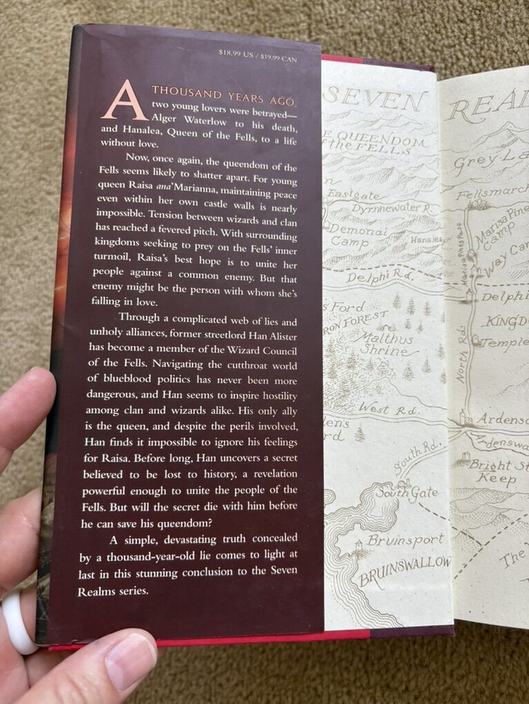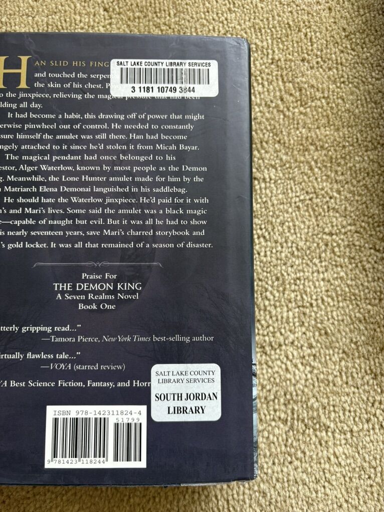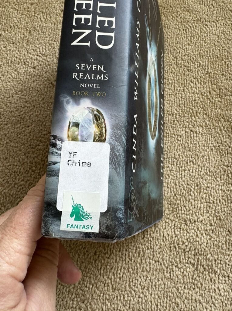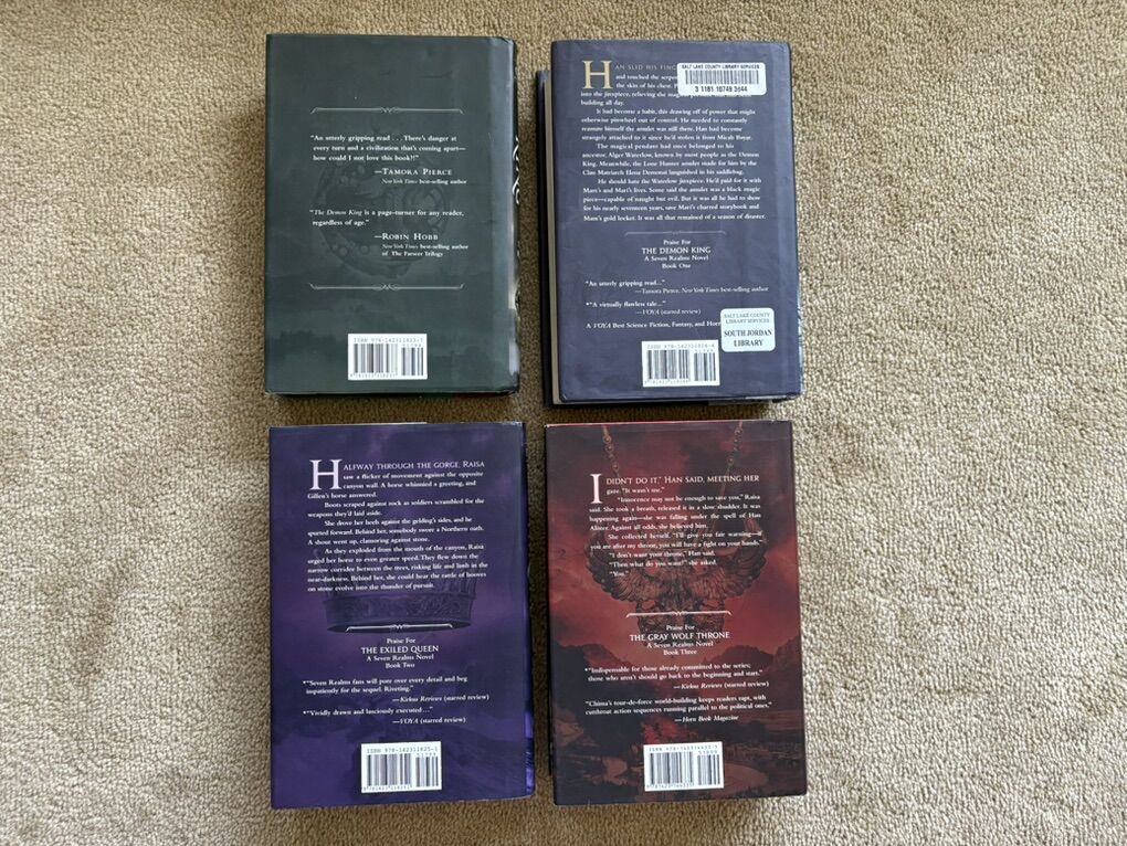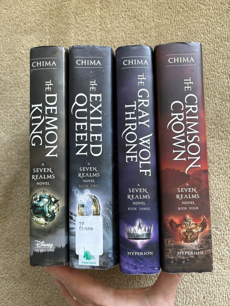 Complete Seven Realms Series books 1-4, by Cinda Williams Chima: The Demon King (2009, 506 pages), The Exiled Queen (2010, 586 pages), The Gray Wolf Throne (2011, 517 pages), and The Crimson Crown (2012, 598 pages). Disney Hyperion. First edition hardcovers 1, 3, and 4 in very good condition, including dust jackets. Book 2 in fair condition—former library book with some wear on cover and jacket, some stickers, and glue (see photos). No missing pages, no marks. Text only. Cash or Venmo. Discount on multiple items.