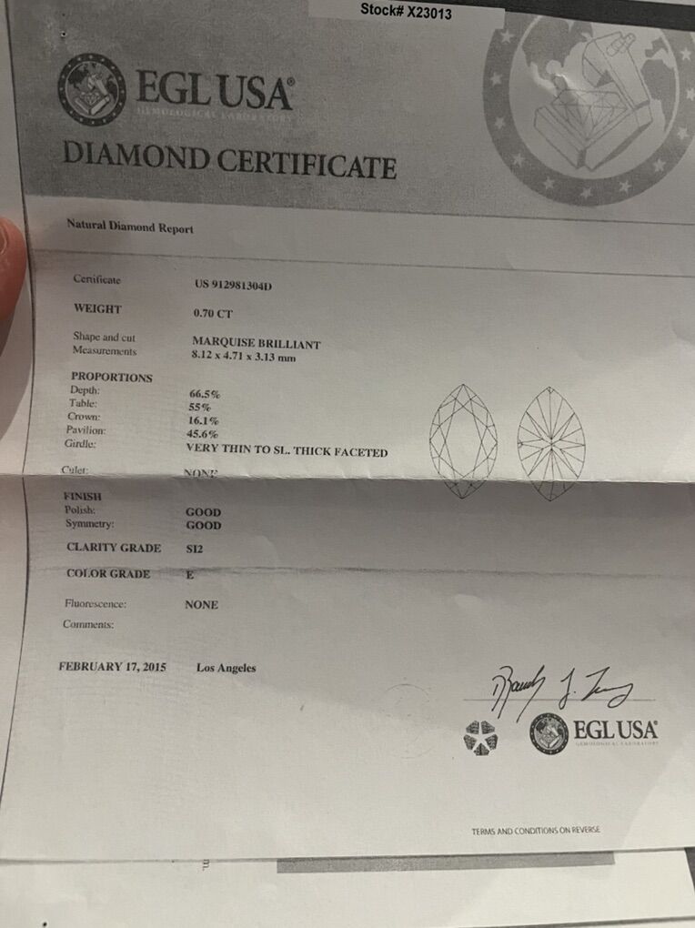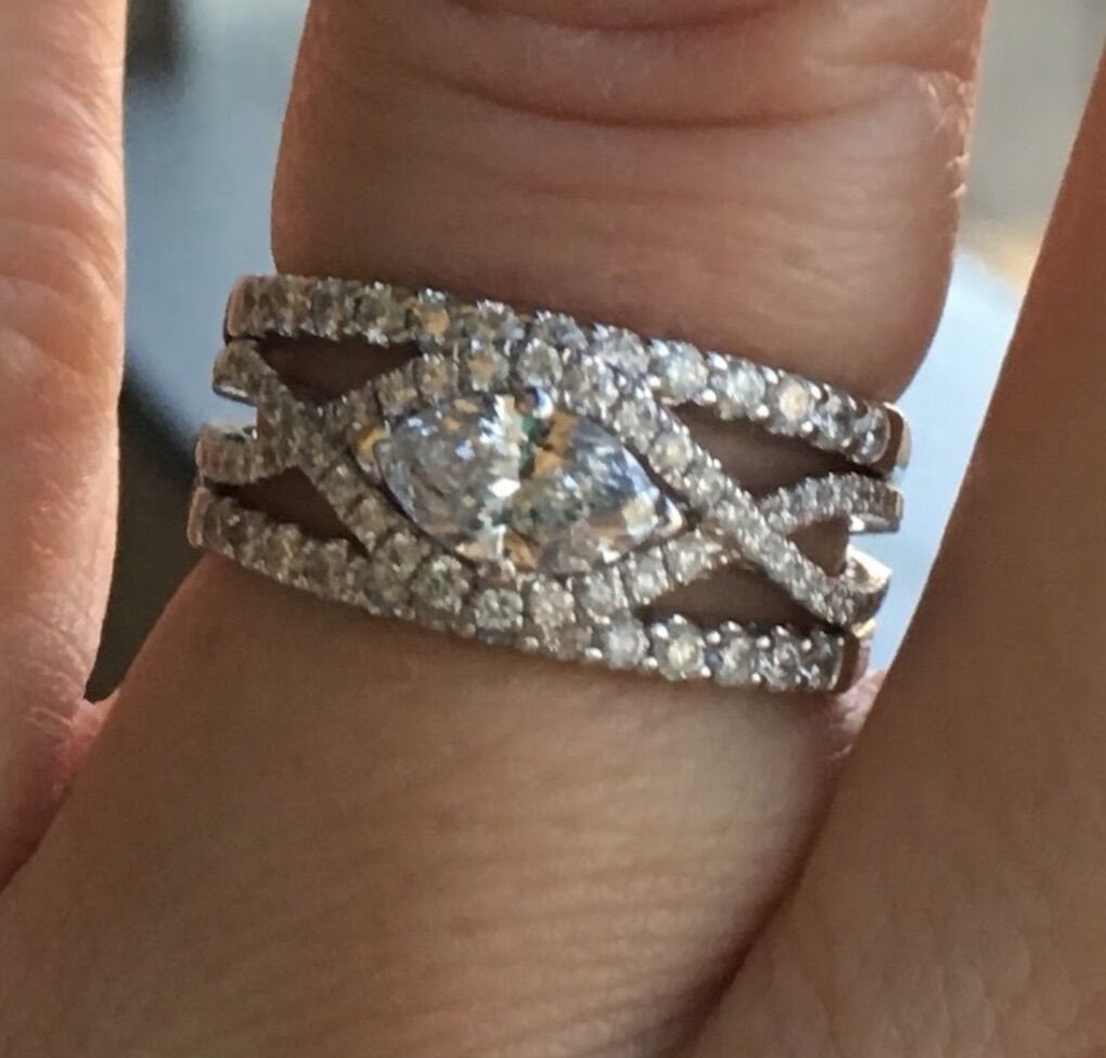 Center Marquis Stone 0.74 ct, 0.85 ct other bands. (0.25,0.25, 0.35) 1.59 total ctw. E color, SI2 Size 7 Serious inquiries only, no trades, cash only, if you are ready this... then YES! It's still available