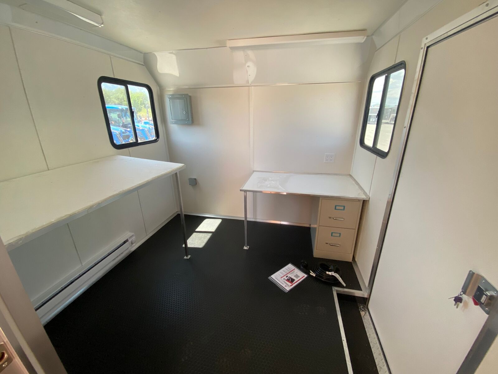 Desk with file cabinet and planning table - Office ready to go Insulated floor, walls and ceiling - Comfortable interior temperature Floor covering - Durable and easy to clean Two horizontal slide windows - Allows sunlight into the office space Side door with flush lock - Security and easy access Wood panel sidewall liner - Attractive and easy to clean Fluorescent light - Even, energy-efficient lighting Partition wall with door - Separates office from storage area