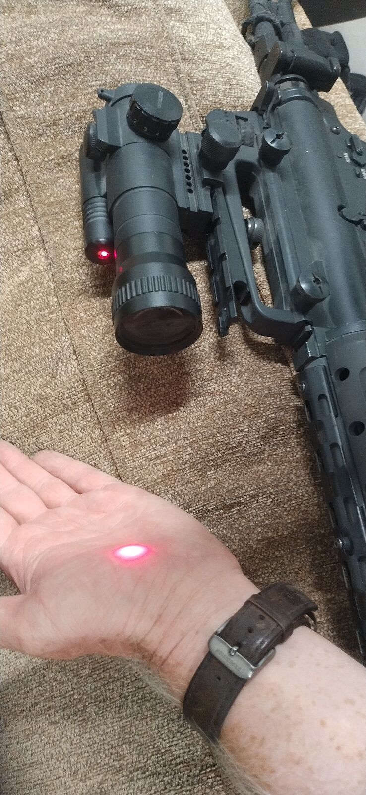 Also included: a red dot with magnification 1,5 or 2, the red dot has a built-in red laser as well. One point sling is also included, as well as a third party m4 carry handle.