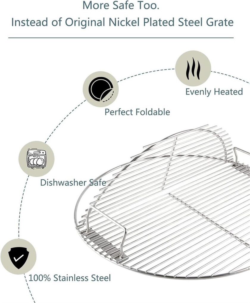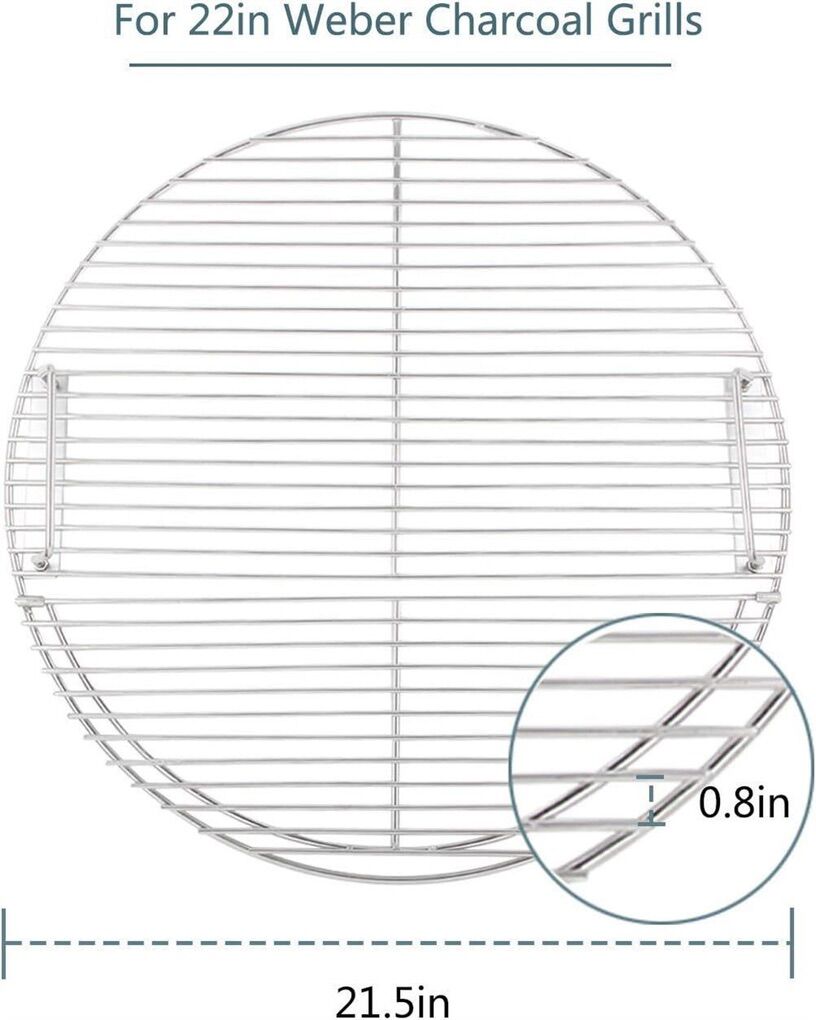 More Safer Than The Original Nickel-Plated Steel Grate This grate is 100% 304 stainless steel.A necessary replacement for Weber Smoky Mountain 22.Don't worry about rust sticking to your food. Fits Perfectly Better Than OEM Very suitable for the 22-inch Weber(WSM 22),which fits like a glove.And applicable to 22.5-inch (about 57.1 cm) Weber gas barbecue system,such as weber 8835. Easy to Add Charcoal Hinged lift-up section can easily add coal flakes to your Weber kettle.There are hinges on both sides,which can be opened,and the direction is different from the handle,which will not affect the use of the handle or flip.Detail design,more considerate. Easily Raise Your Grate without Any Lifting Tools With two protruding side handles,you can easily lift the grate