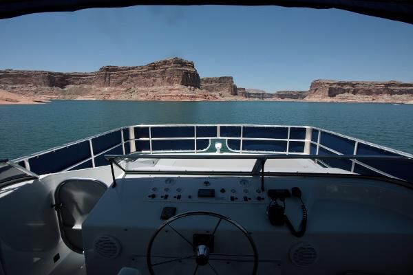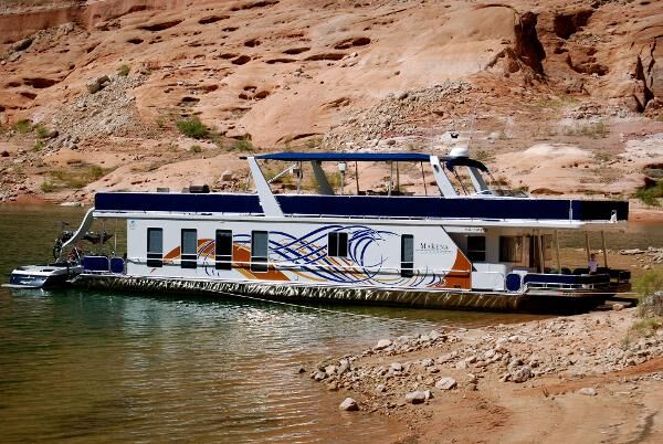 The houseboat is wet-slipped at Antelope Point Marina.