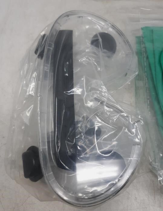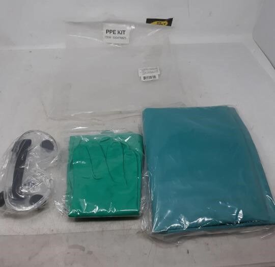 Stay protected in workplace or medical environments with this all-in-one PPE Safety Kit. This kit includes essential personal protective gear: clear anti-fog safety goggles, a pair of green latex gloves with textured fingertips for grip