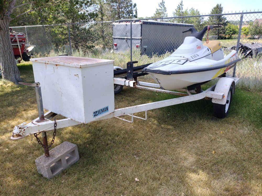 jetski not included! Nice two place jetski trailer. Zieman brand with metal fenders and metal locking storage bin. will fit two full size 3 seater jet skis. tires on trailer hold air but tread is worn. not cracked just balding. will need new tires. good old trailer.