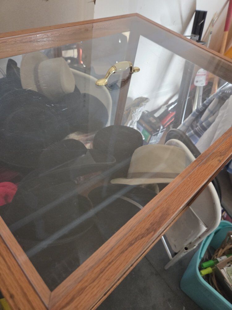 three glass sides, 1 mirrored side handled lids, plex glass wood bottom and trim. medium oak