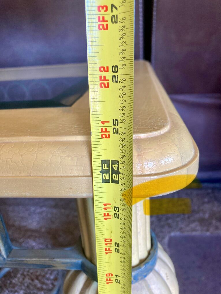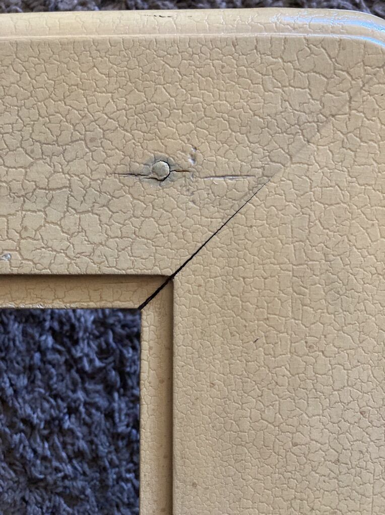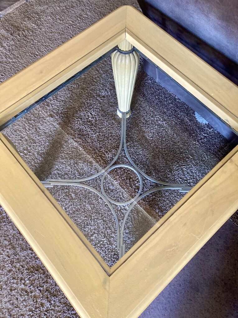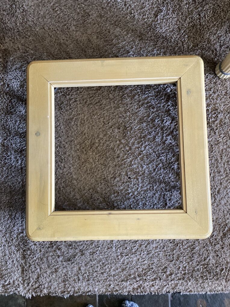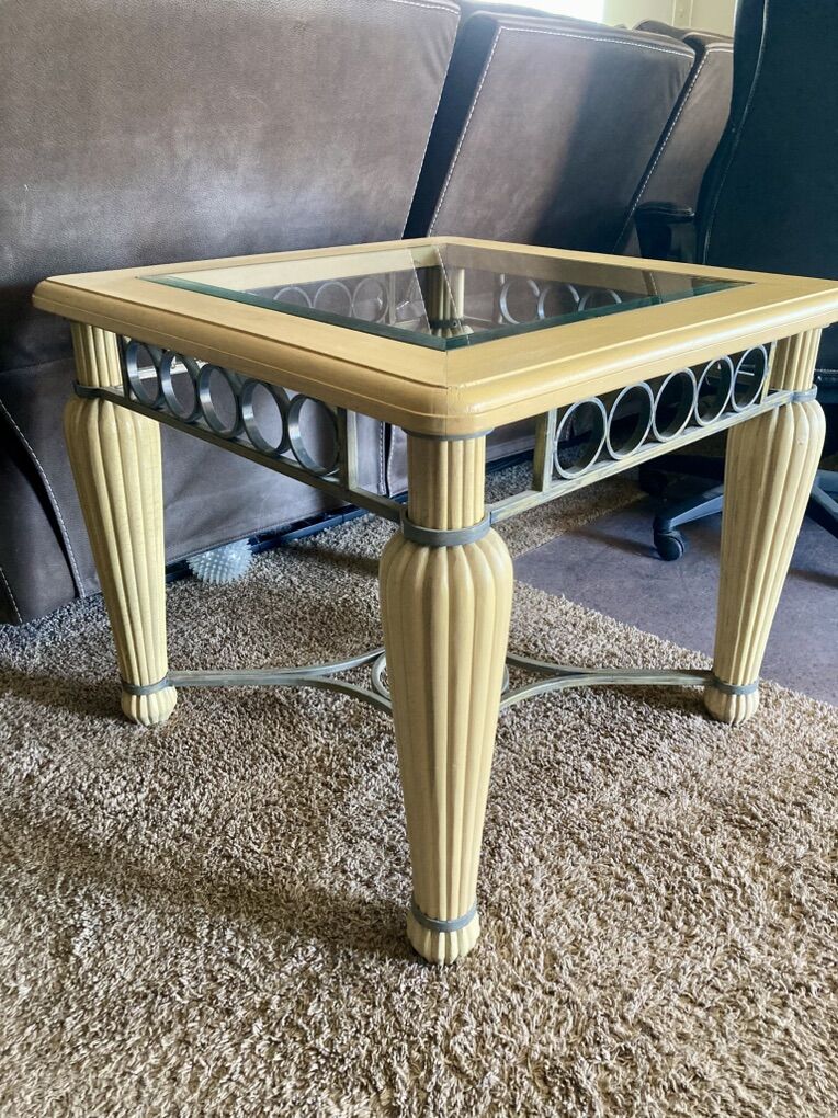 Two real wood side tables. The corners of one are a little separated. Yellowish in color.