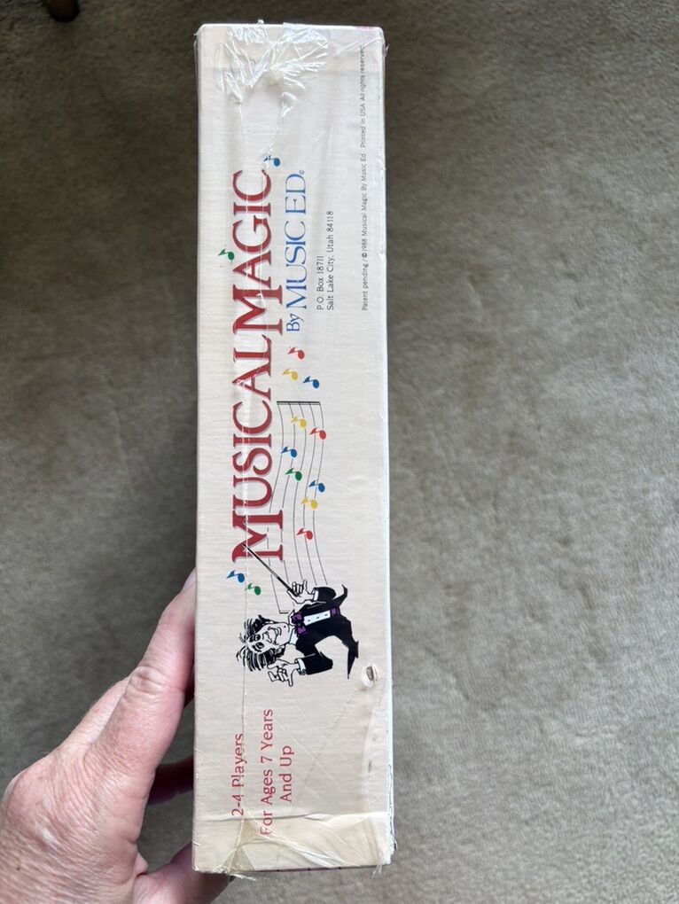 NEW (sealed in plastic) Vintage 1988 Musical Magic Game. A fun way to learn the fundamentals of reading music. An exciting game for everyone! A must for beginning music students. By Music Ed, Salt Lake City Ut, 1988. 2-4 players, ages 7+. New, unopened condition. Corner of box slightly damaged (see photos), plastic torn in a couple of places. Text only. Cash or Venmo. Discount on multiple items.