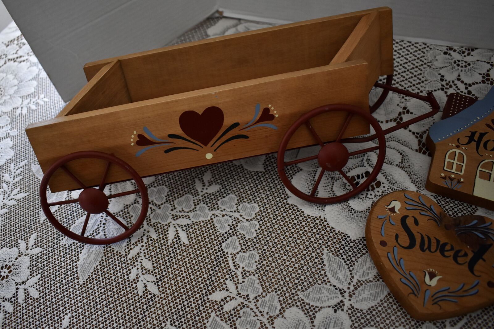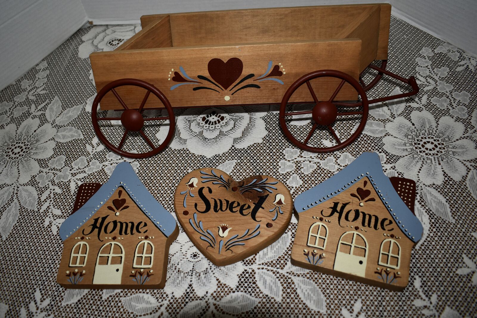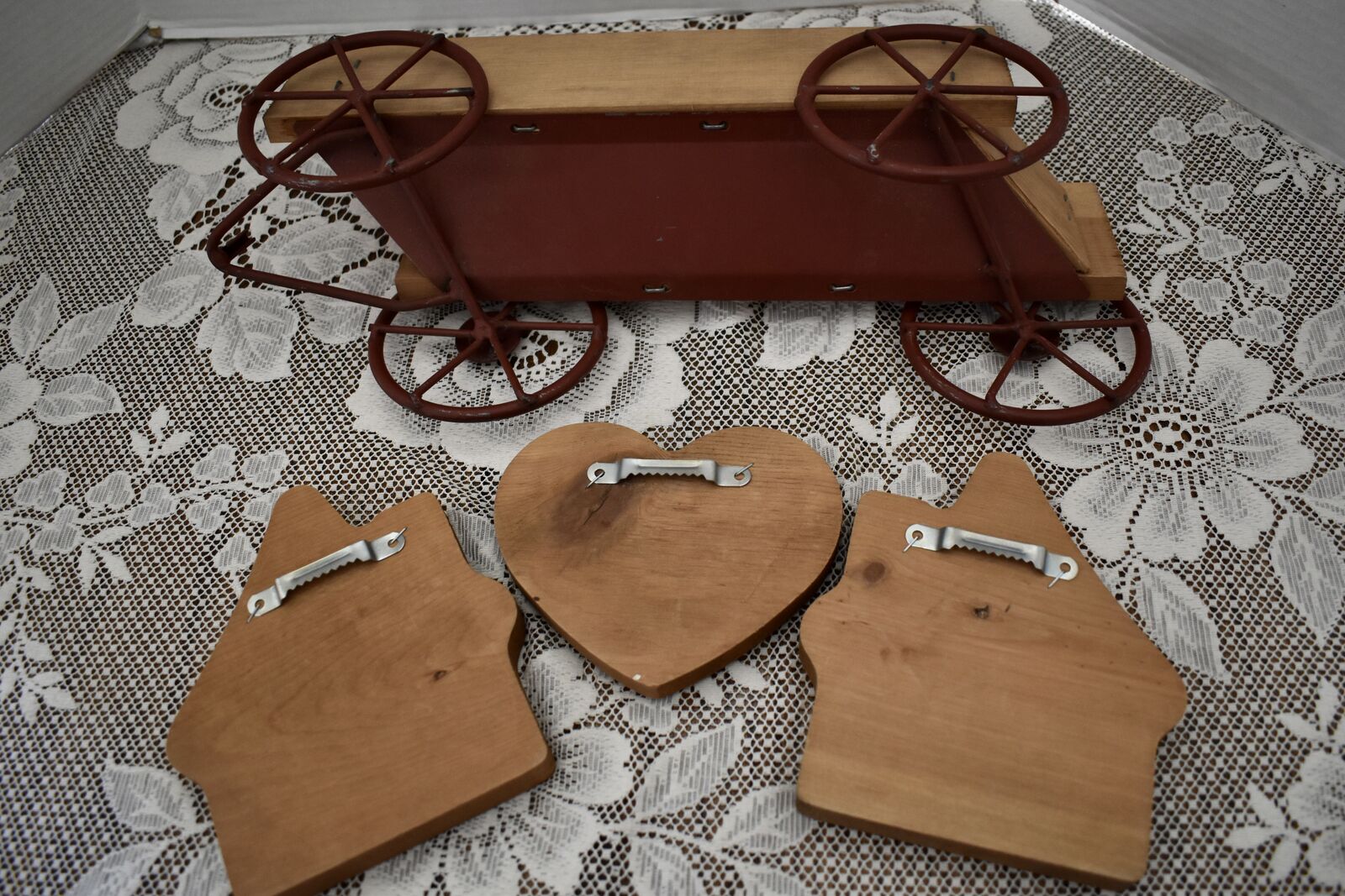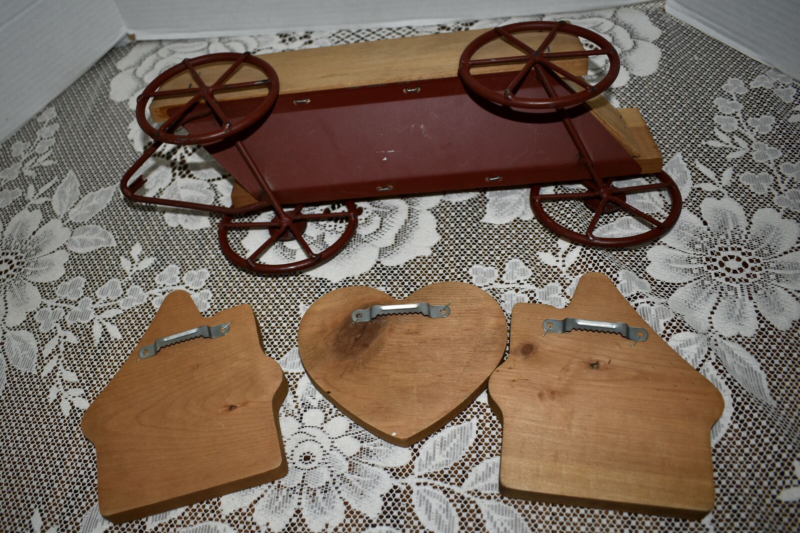 IT MEASURES… The wooden wagon sits approx. 6 inches tall on the wall and it is approx. 15 1/2 inches wide from end to end and 4 1/2 inches deep. The House shape is approx. 5 3/4 inches tall and 5 1/4 inches wide. The Heart shape is approximately. 5 inches wide and 4 1/2 inches tall. The inside area of the wagon measures.. approx. 2 1/4 inches deep and 2 1/2 inches tall and it is approx. 11 inches wide across ( this area is great for putting little flowers or other fun foliage or whatever you desire to do inside of.