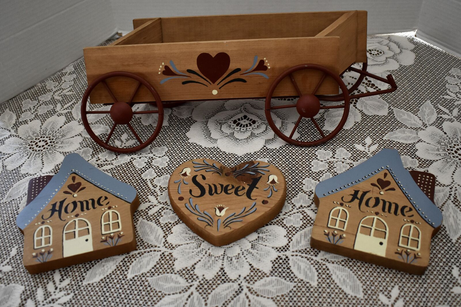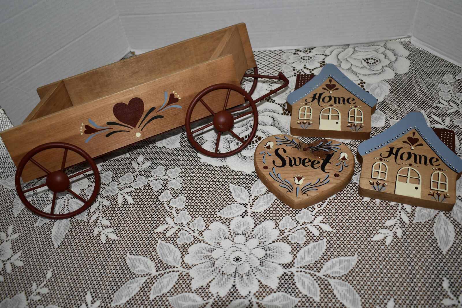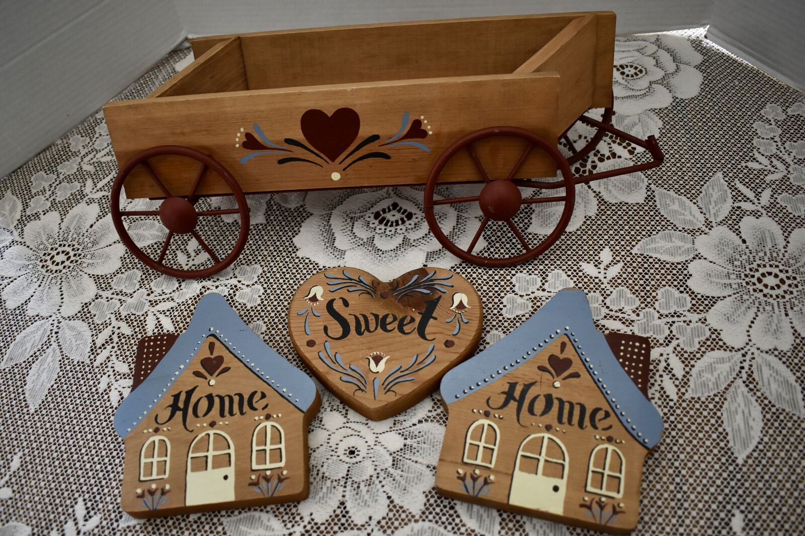 IT MEASURES… The wooden wagon sits approx. 6 inches tall on the wall and it is approx. 15 1/2 inches wide from end to end and 4 1/2 inches deep. The House shape is approx. 5 3/4 inches tall and 5 1/4 inches wide. The Heart shape is approximately. 5 inches wide and 4 1/2 inches tall. The inside area of the wagon measures.. approx. 2 1/4 inches deep and 2 1/2 inches tall and it is approx. 11 inches wide across ( this area is great for putting little flowers or other fun foliage or whatever you desire to do inside of.
