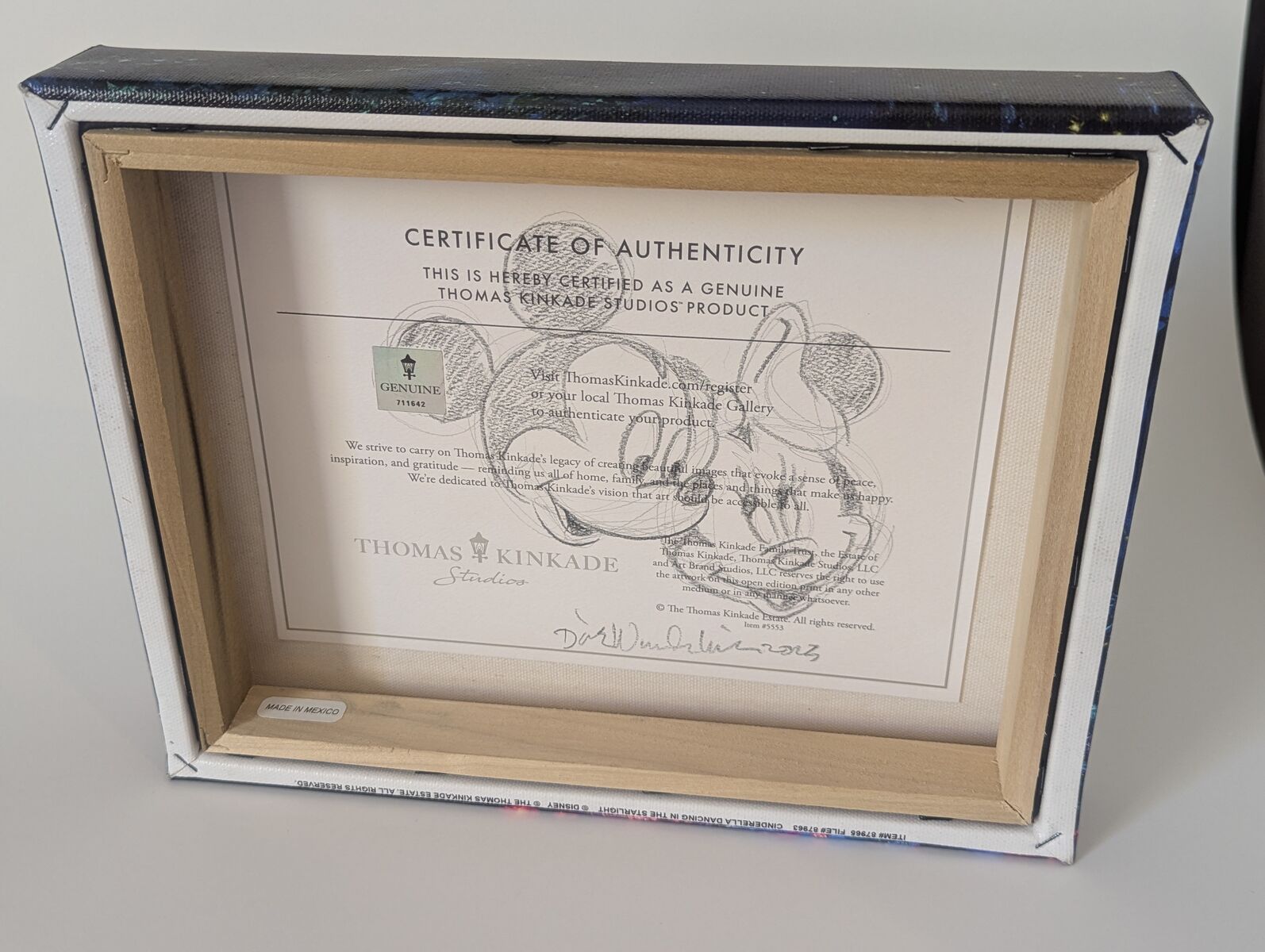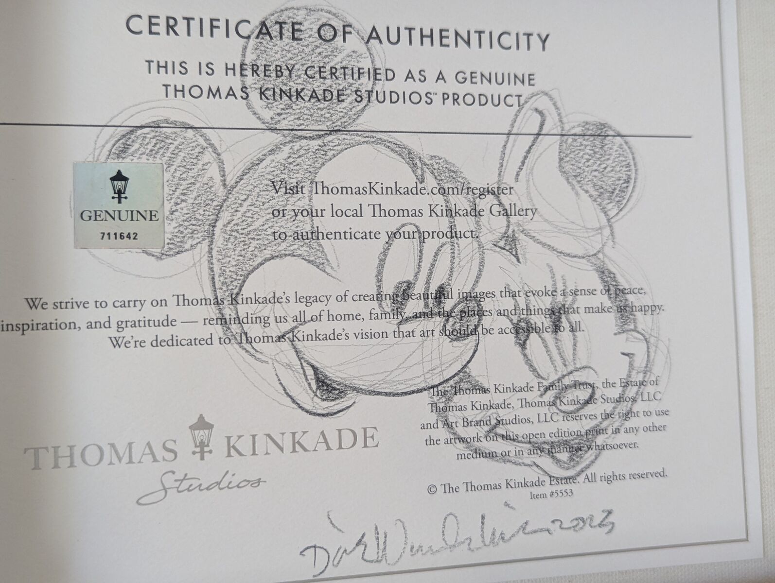The certificate of authenticity was signed by Dirk Wunderlich at the Gallery on Disneyland's Main Street in 2023 - he included a pencil drawing of Mickey and Minnie above his signature, making it a unique and collectible piece for art enthusiasts and Disney fans alike.