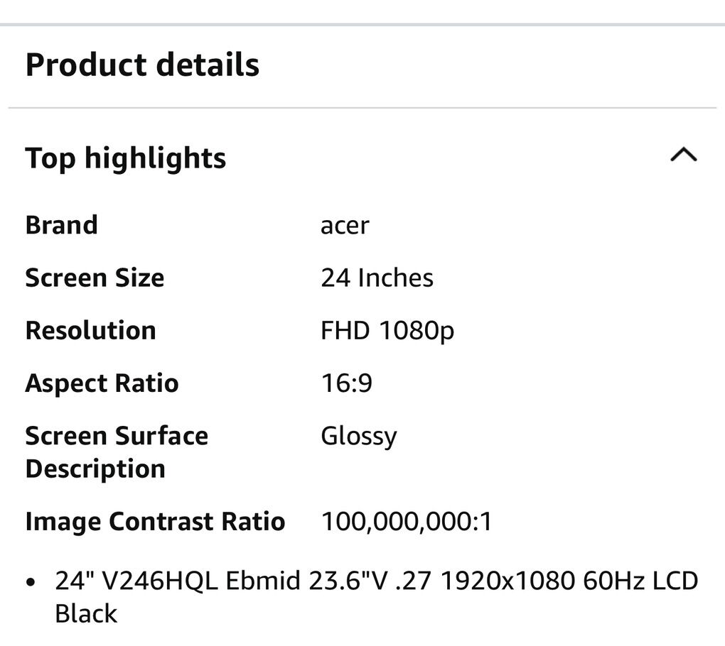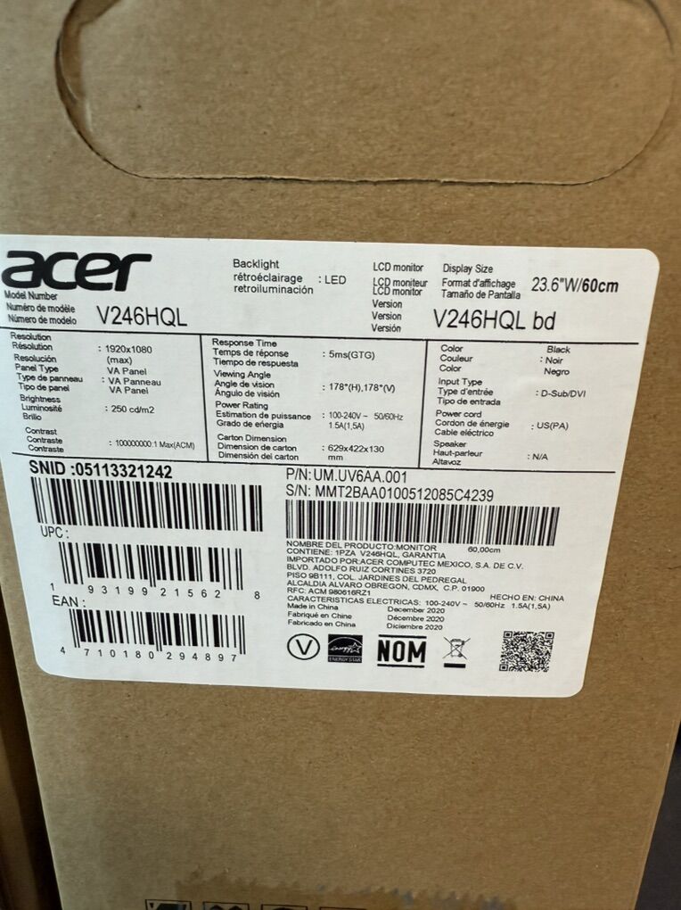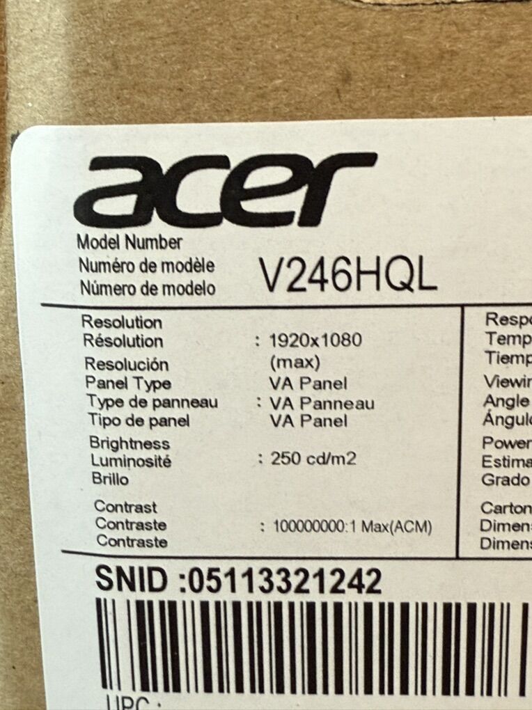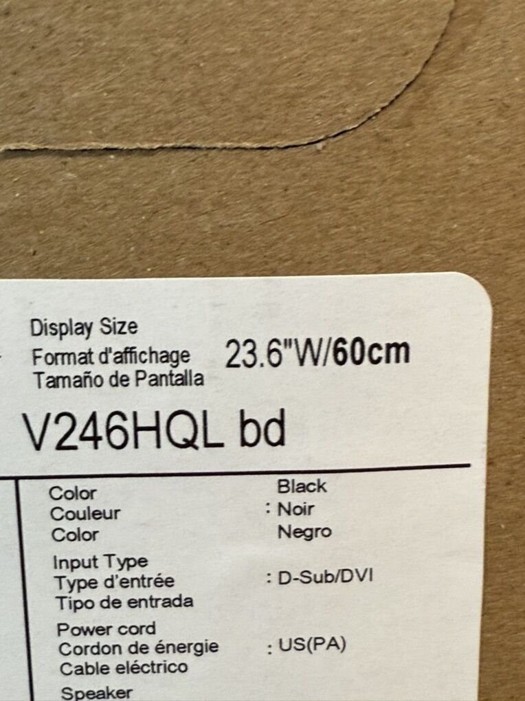 Technical Information Number of Screens 1 Viewable Screen Size 59.9 cm (23.6) Screen Mode Full HD Panel Technology Vertical Alignment (VA) Response Time 5 ms Aspect Ratio 16:9 Pixel Pitch 0.27150 mm x 0.27150 mm Horizontal Viewing Angle 178° Vertical Viewing Angle 178° Backlight Technology LED Mount Type Wall Mountable Horizontal Frequency 30 kHz to 80 kHz Vertical Frequency 55 Hz to 75 Hz Maximum Adjustable Height No Tilt Angle -5° to 25° Adjustable Display Pivot No Physical Characteristics VESA Mount Compatible Yes VESA Mount Standard 100 x 100 Colour Black Height 335.9 mm Width 567 mm Depth 60.7 mm Height with Stand 421.20 mm Width with Stand 567 mm Depth with Stand 206.80 mm Weight (Approximate) 3.47 kg Weight with Stand (Approximate) 3.92 kg Video Maximum Resolution 1920 x 1080 Standard Refresh Rate 60 Hz Colour Supported 16.7 Million Colours Colour Depth 6-bit+Hi-FRC Dynamic Contrast Ratio 100,000,000:1 Brightness 250 cd/m² Color Gamut 72% NTSC Native Contrast Ratio 3,000:1 Miscellaneous Package Contents V246HQL Widescreen LCD Monitor Power Cord 1 x VGA Cable Environmentally Friendly Yes Environmental Certification TCO Certified Interfaces/Ports DVI Yes VGA Yes Power Description Operating Power Consumption (Energy Star) 20.30 W Input Voltage 120 V AC 230 V AC Operating Power Consumption (EEL) 27 W