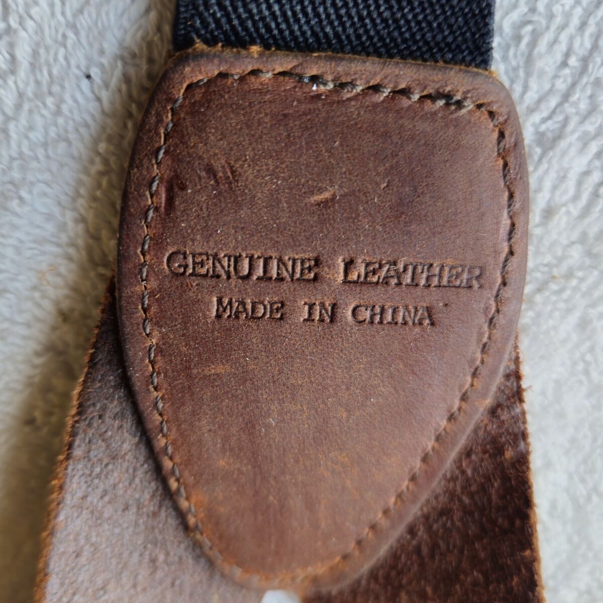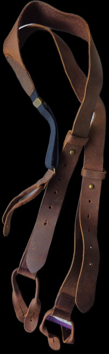 VenmoVINTAGE Latigo Leather Suspenders -Brass Button Rivets Condition NEW Men or Women and Adjustable !! A more expensive leather due to the more-involved tanning process, which requires more steps. Latigo leather is both durable and pliable, making it suitable for rigorous activities and applications with rough usage. It is resistant to moisture and sweat, due to the high amounts of oil it is infused with during manufacture. Water proofing prevents wear and discoloration. In addition, applying a small amount of conditioner containing beeswax will preserve the latigo leather’s surface and flexibility. Great for jeans or leather fashions and goods. Adjustable leather straps, 37"- 45" min. /elastic. Brown Reasonble offers considered!
