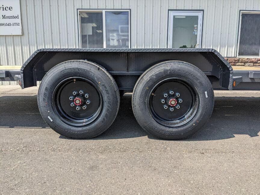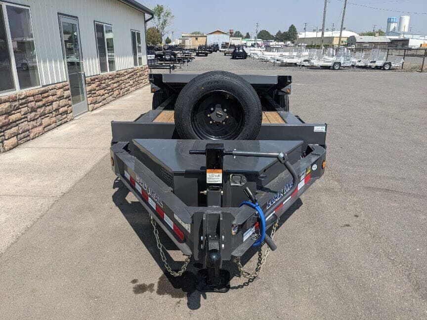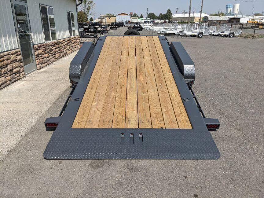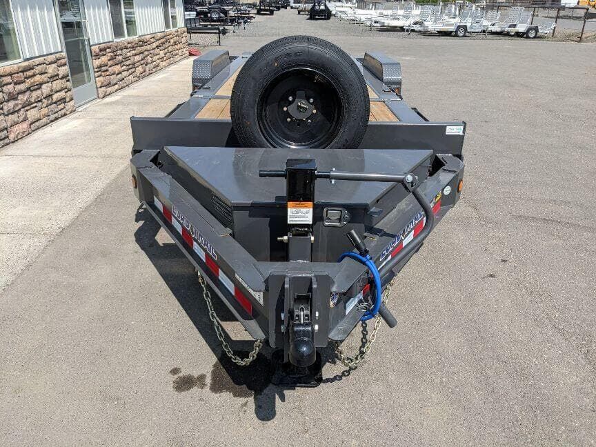 |The TH model features a 16-foot tilt deck built on a robust I-beam frame. A 6-foot front stationary section complements the tilt deck, providing ample space for tie-downs and tool storage. The trailer rides on dual 8,000-pound Dexter torsion axles with Nev-R-Adjust brakes for smooth stopping and confident control. With 16-ply tires and a matching spare, you’ll be prepared for long hauls and rough terrain. The exterior sports Gun Metal Gray with primer, signaling a durable finish ready for work or play.