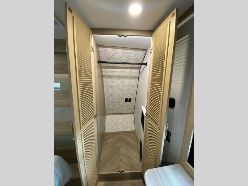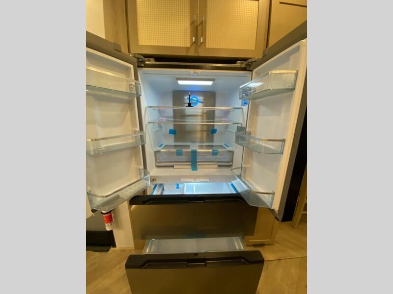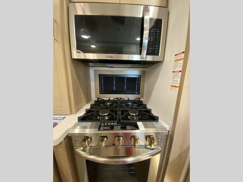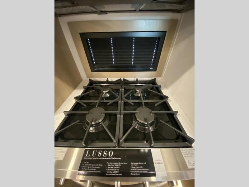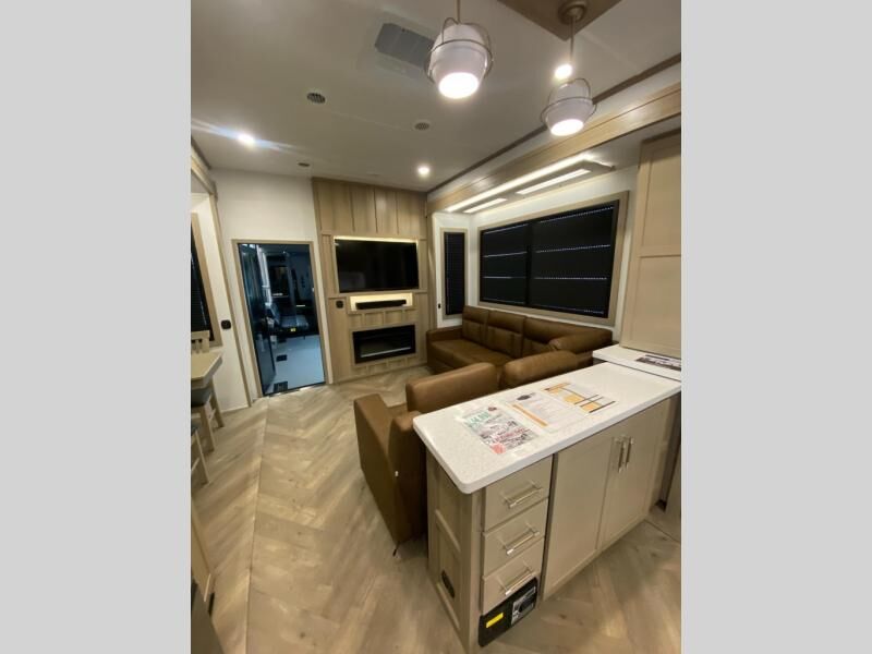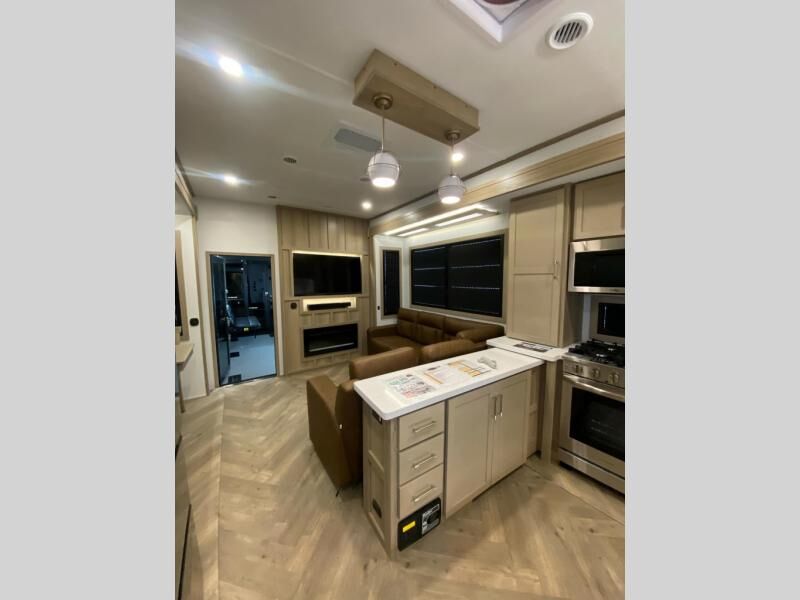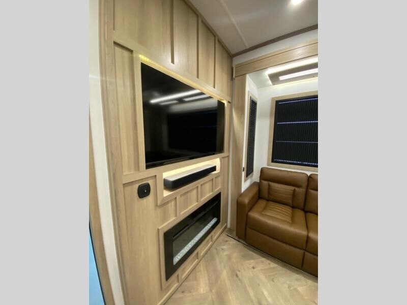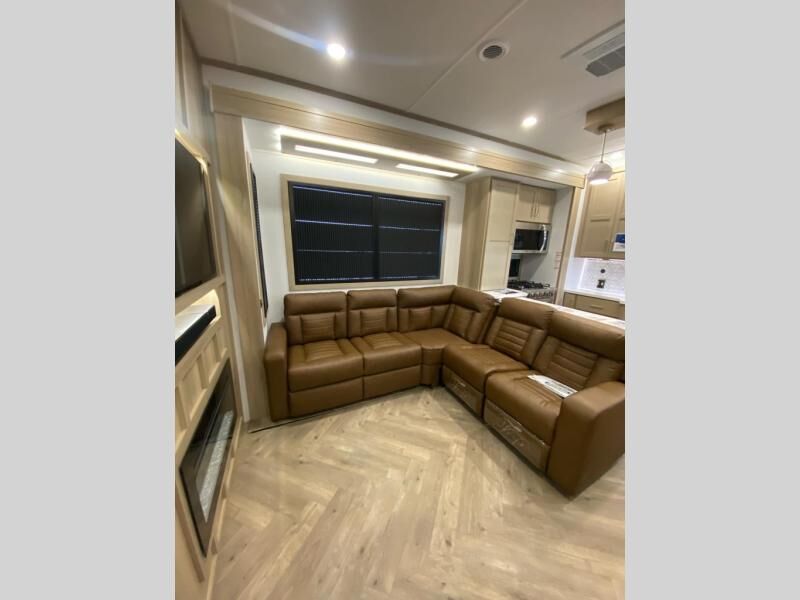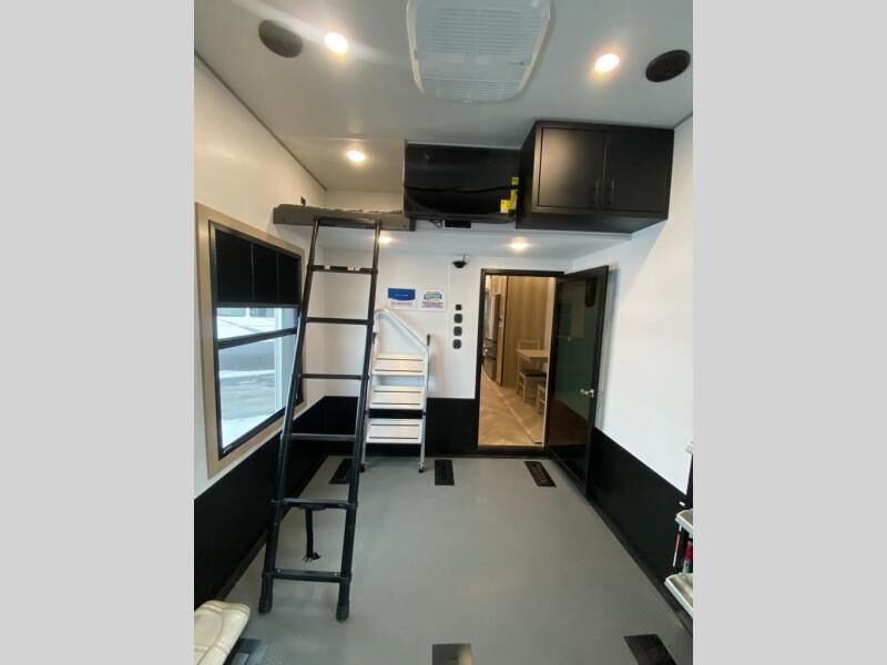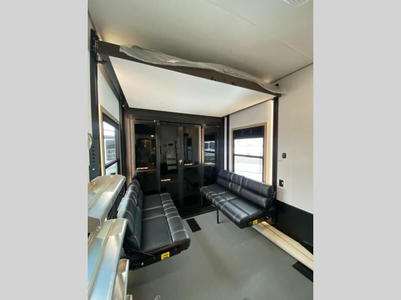 The whole family will love camping in this fifth wheel toy hauler! The front private bedroom has a king bed slide for more interior space, a Smart LED TV, a front large wardrobe, plus washer and dryer prep. Freshen up each morning in the full bathroom with the fiberglass one-piece shower then head to the kitchen to fry up some eggs on the four burner Lusso range and bake some cinnamon rolls in the 24" stainless steel oven. Grab a cold cup of orange juice from the 20 cu. ft. 12 volt refrigerator and enjoy it along with the eggs at the dinette table or in the 14' garage on one of the dual opposing sofas with cupholders. The L-shaped hide-a-bed sofa is conveniently across from the entertainment center with a 50" Smart LED TV and fireplace. As you head into the 14' garage area, you will notice a HappiJac bed with a 32" x 74" mattress, a queen bed above the opposing sofas, Raptor exclusive frame welded tie downs, and one of the dual entry doors to the unit!