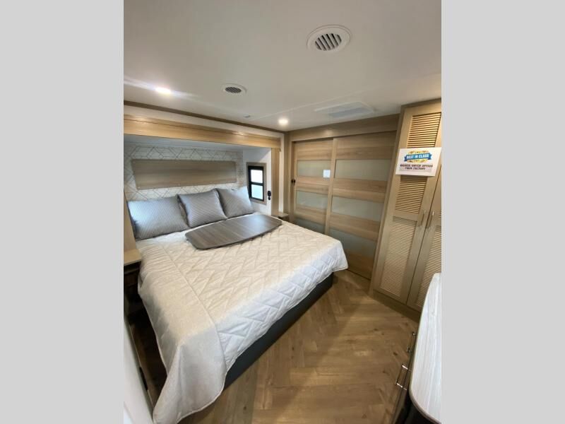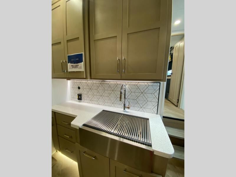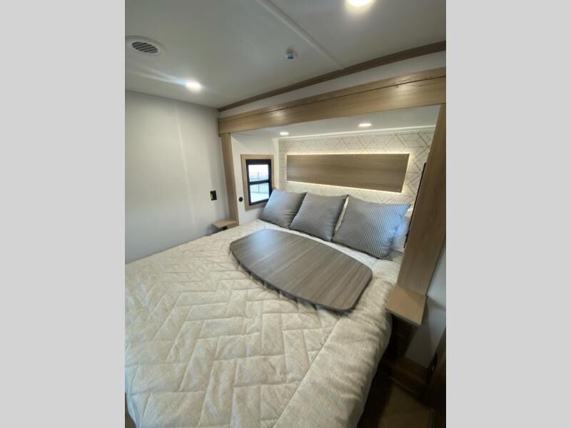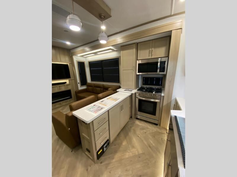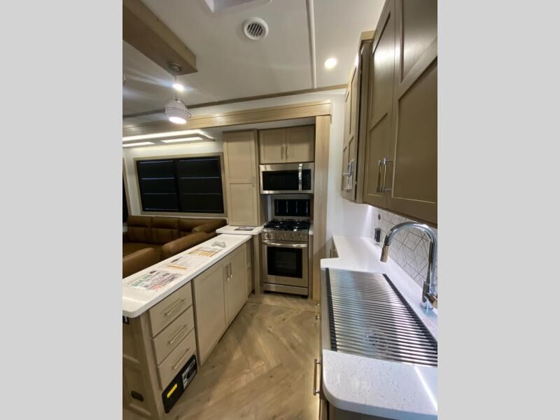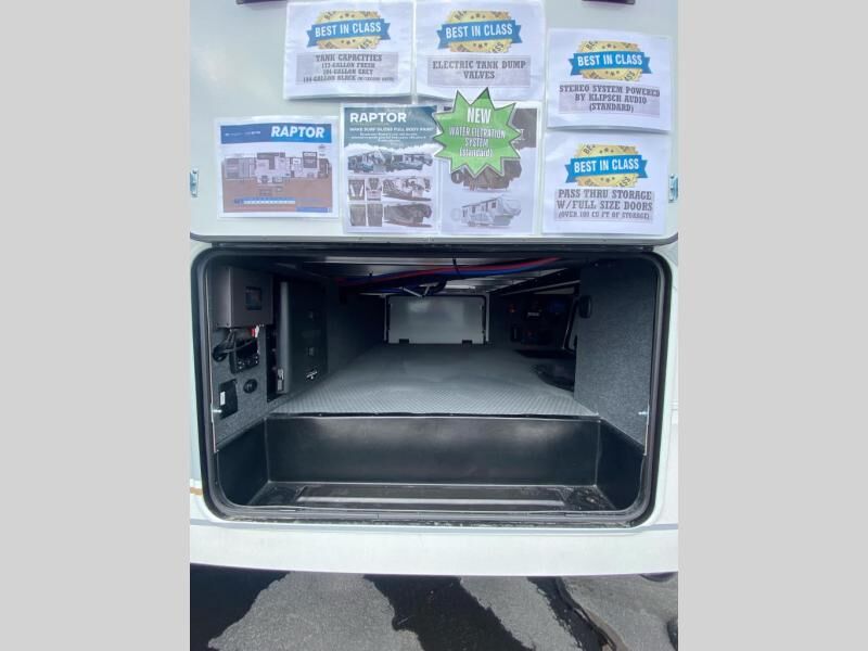 Experience a breath of fresh air with one of these Keystone RV Raptor fifth wheel toy haulers! Their rugged construction consists of a one-piece Alpha Super Flex TPO roof membrane, Dyna Span floor decking, and 5,000 lb. frame-welded tie- downs to keep your toys in place as you travel. Some unexpected conveniences you will appreciate include an Omni-Chill A/C system to keep you cool on those hot summer days, a Furrion backup camera, MaxTurn™ technology with a Helux™ pin box, and a Generation 3 iN-Command smart automation system with Global Connect to make life easier. There is also designer style vinyl flooring throughout, along with hardwood ceiling treatment with LED accent lighting, beach wood and white cabinetry, and many more interior comforts!