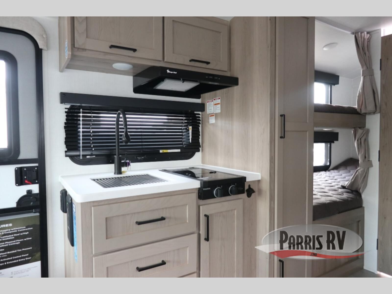 You're going to love camping with your family or friends in this spacious bunk model! The bunk beds will be perfect for little ones, while you take the front full-size bed. There is also a 44" booth dinette within the slide out for additional sleeping and seating space. The kitchen includes everything the chef will need to prepare meals each day, including a recessed cooktop, microwave oven, and a 12V refrigerator for perishables. If the weather is nice, you may just find the chef outdoors cooking on the outside griddle under the 14' power awning. And check out the exterior bike door that will be perfect for bikes, luggage, or extra camp gear. The optional Power Package available on this model includes three 200W solar panels, a 460 Ah Mastervolt MLI lithium-ion battery, two smart remotes, and more off-grid features!