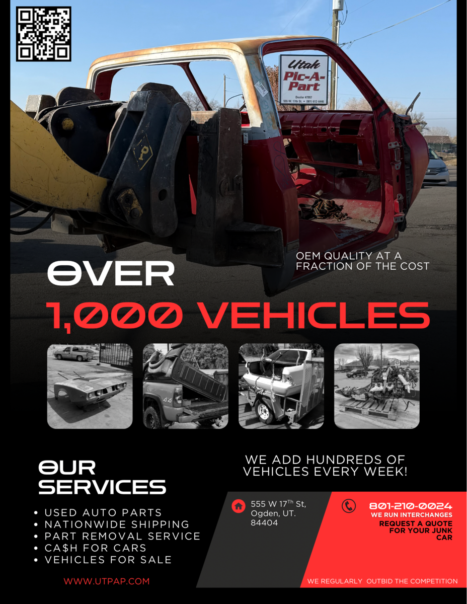 We run interchanges to help you find the part you need, even if it comes from a different year or model. Browse our full vehicle selection or request a quote for your junk car on our website, UTPAP.com.