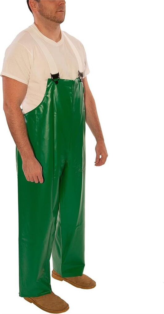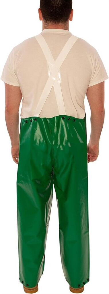 Polyester Imported Therm-O-Rad sealed seams for 100% liquid proof protection. Plain front. Premium snap lock suspender buckles.